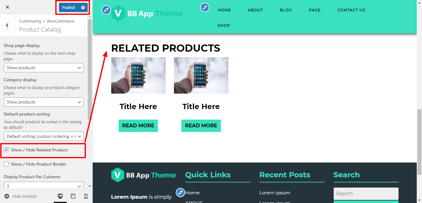 Here You have an option to Enable / Disable Feature Related product of shop page by click on checkbox.