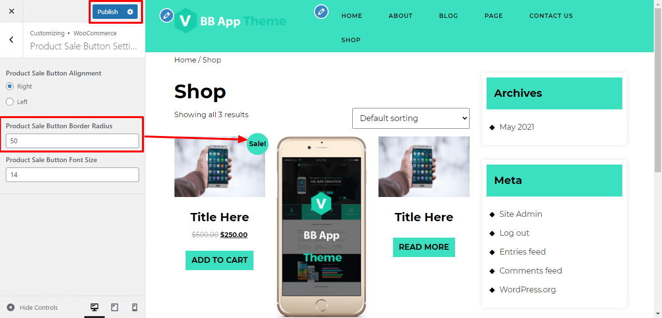 Here You have an option to add border radius for product sale button of the theme.