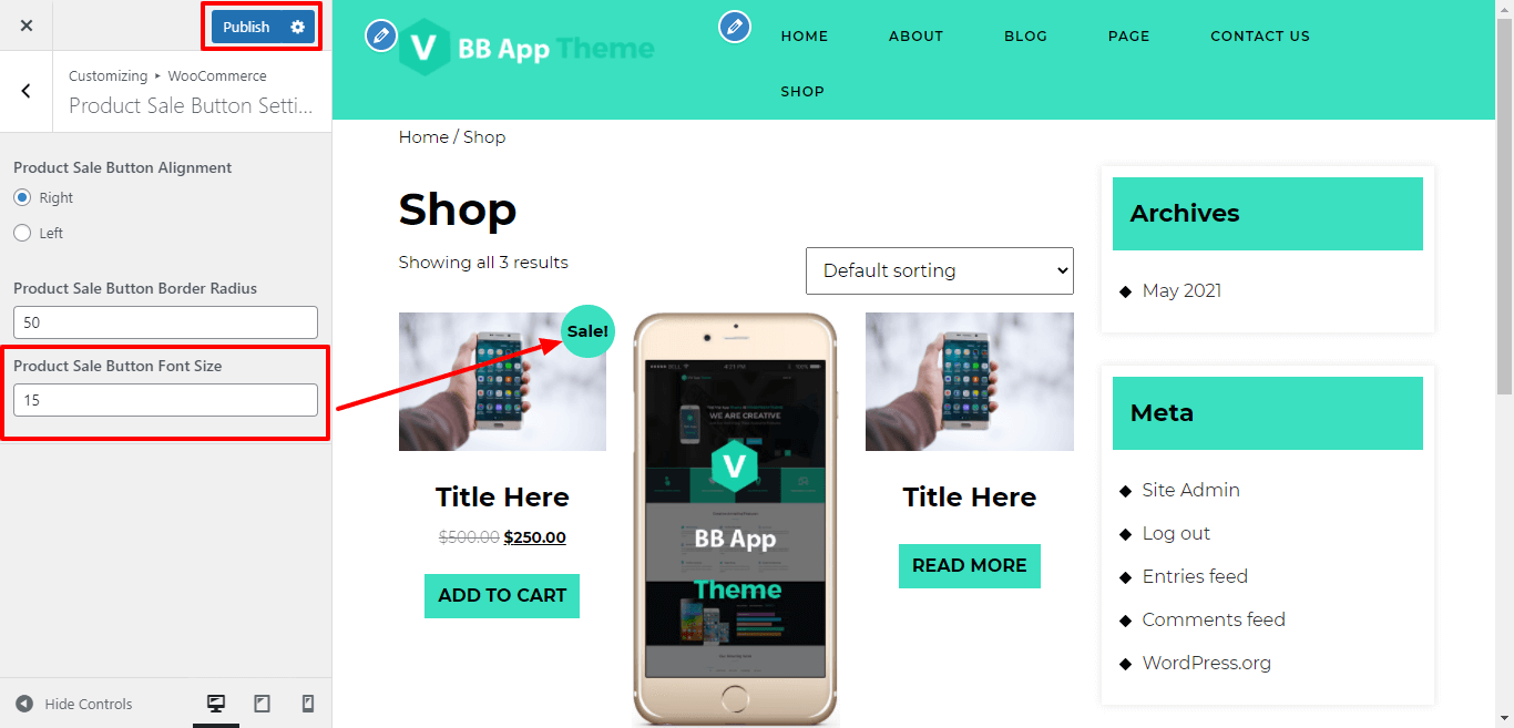 Here You have an option to add sale button font size of the theme.