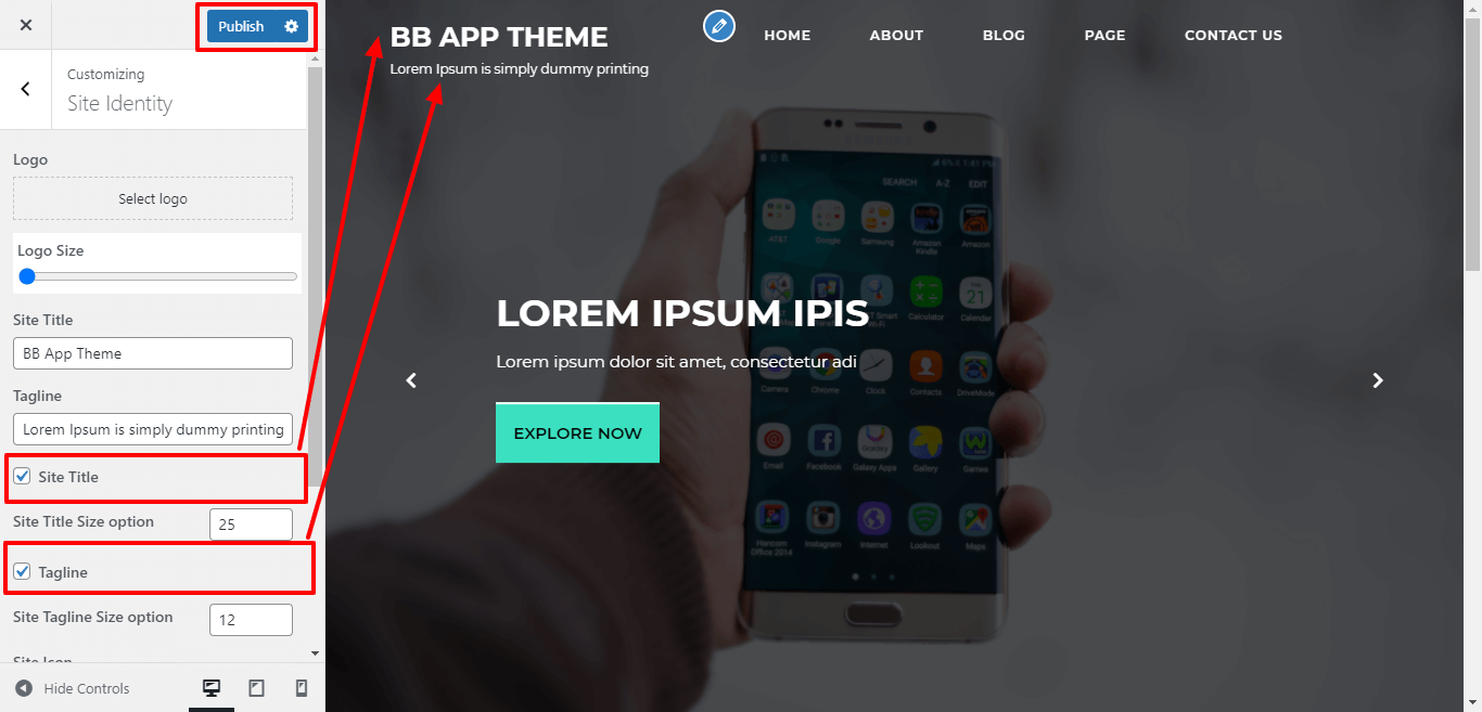 For show / hide site title and tagline for the theme, click on the checkbox for the theme.