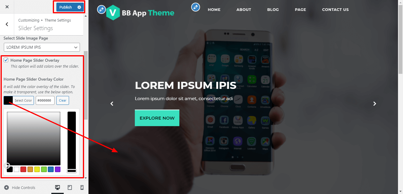 Here You can select show / hide slider image overlay and select the Background color, for Slider Image display transparent.