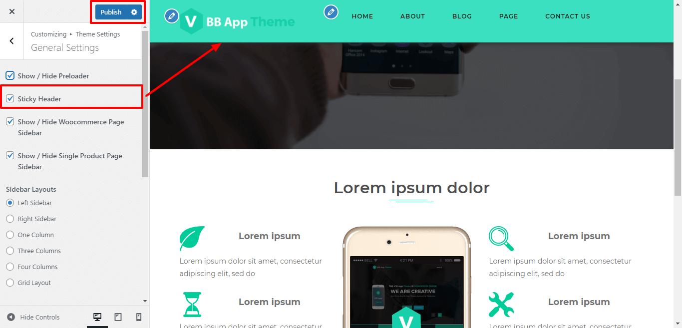 For the sticky header of the theme click on checkbox for the theme.