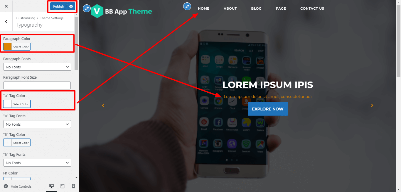 1. Color: Here you can change the colors of all Paragraph, 'a' tag, 'li' tag, H1, H2, H3, H4, H5 and H6 respectively.