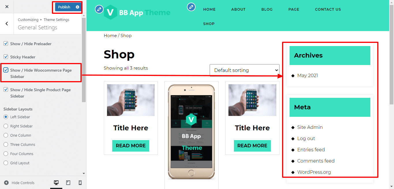 In Layout Settings, Here You can click the checkebox if you want to show / hide woocommerce page sidebar.