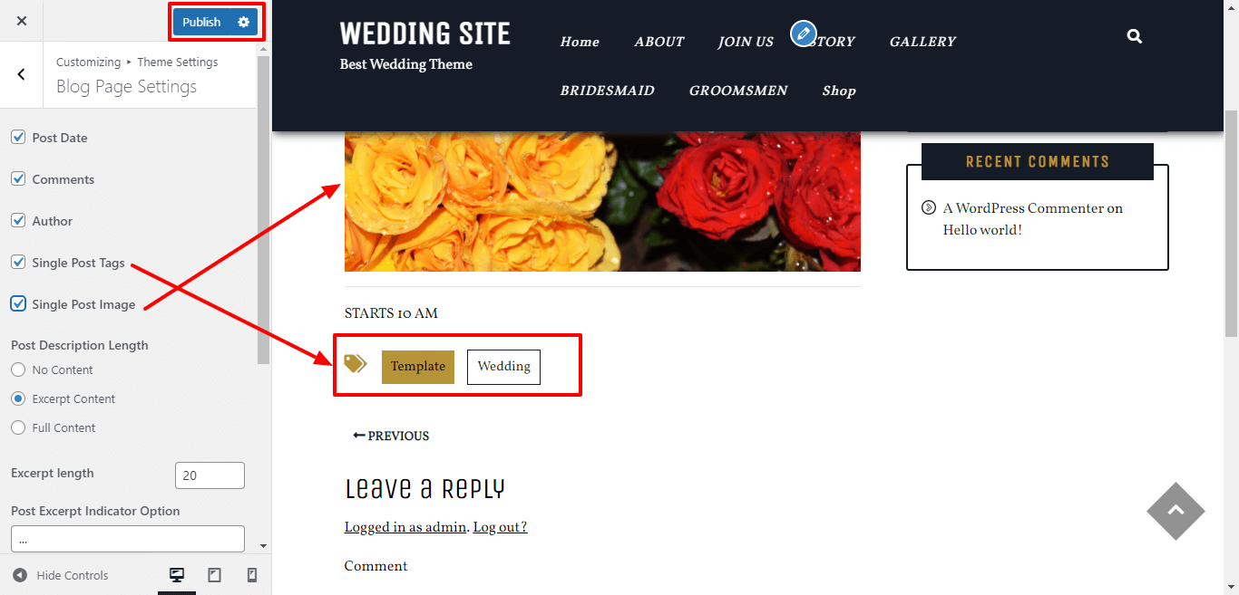 For show / hide single post tags and single post image, click on the checkbox for the theme.