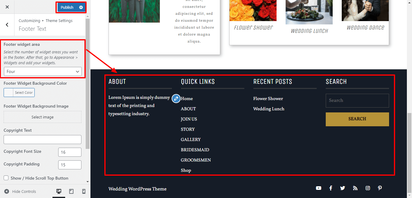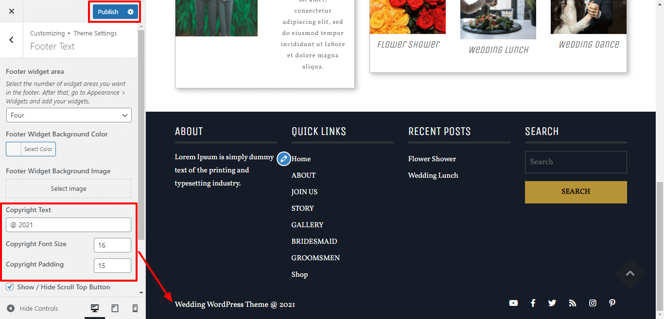 Here you can add the copyright text , copyright text alignment, copyright font size and padding for copyright text.