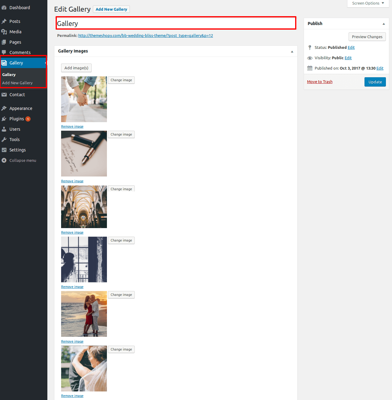 Once you activate the plugin it will allow you to access three register posttype namely:Gallery on the Dashboard. This plugin will help you to setup gallery Section.