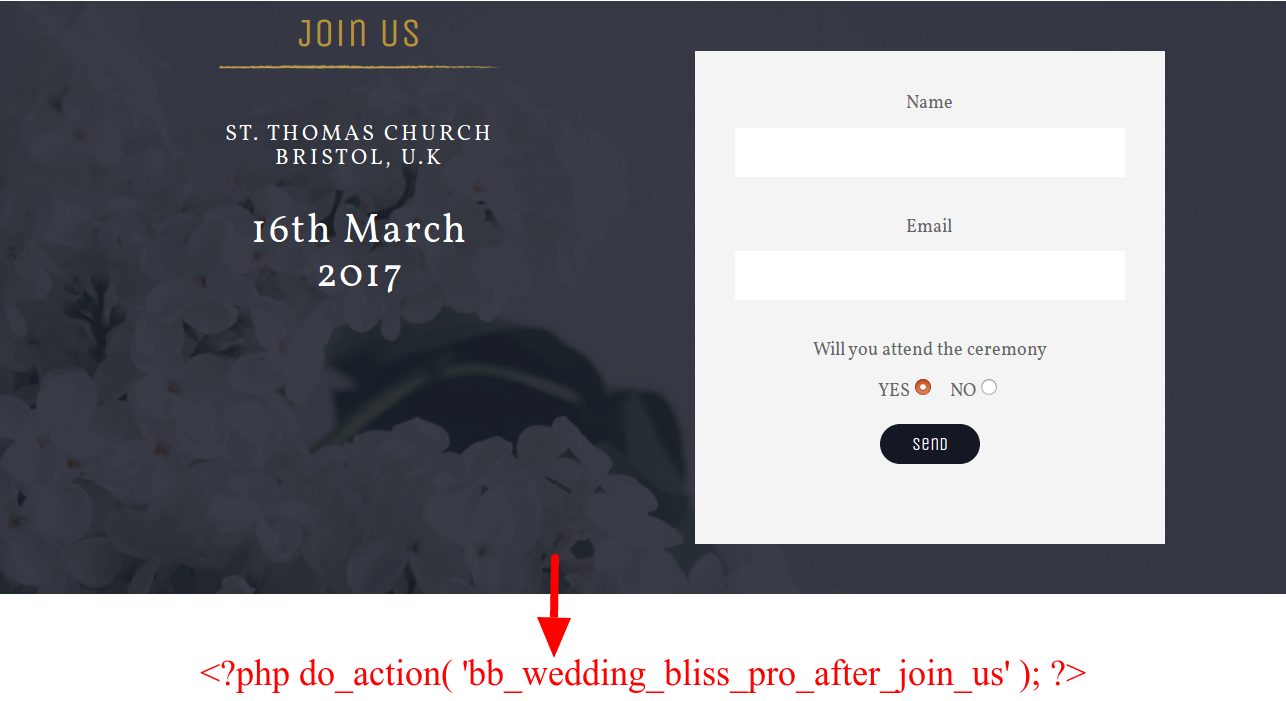In this section you can set Background Image, Title, Address and Date. Add the contact form7 plugin to your wordpress account. Activate the plugin and create your own form. Once you have done with this copy it's shortcode ( "[contact-form-7 id="10" title="Contact form 1"]" ) and add to to the