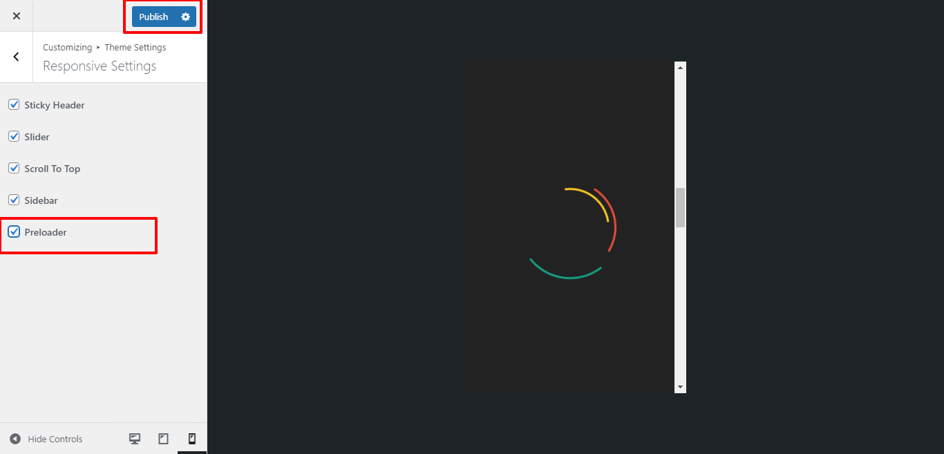 For Enable / Disable preloader for mobile device or responsive media click on checkbox .