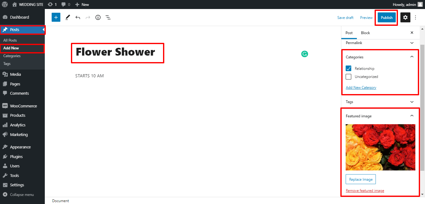Here You can add the Title , Some content and featured image, select the Categories and then click on publish button.