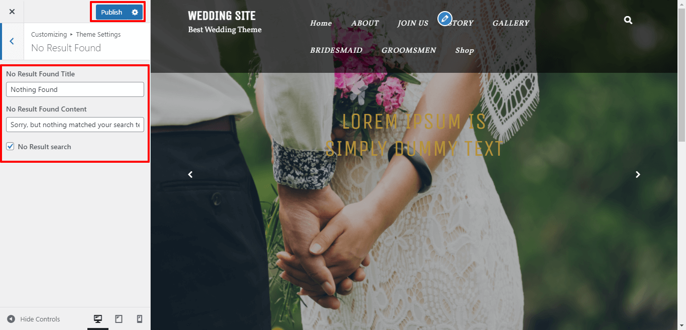 Go to Appearance >> Customize >> Themes Settings >> No Result Found