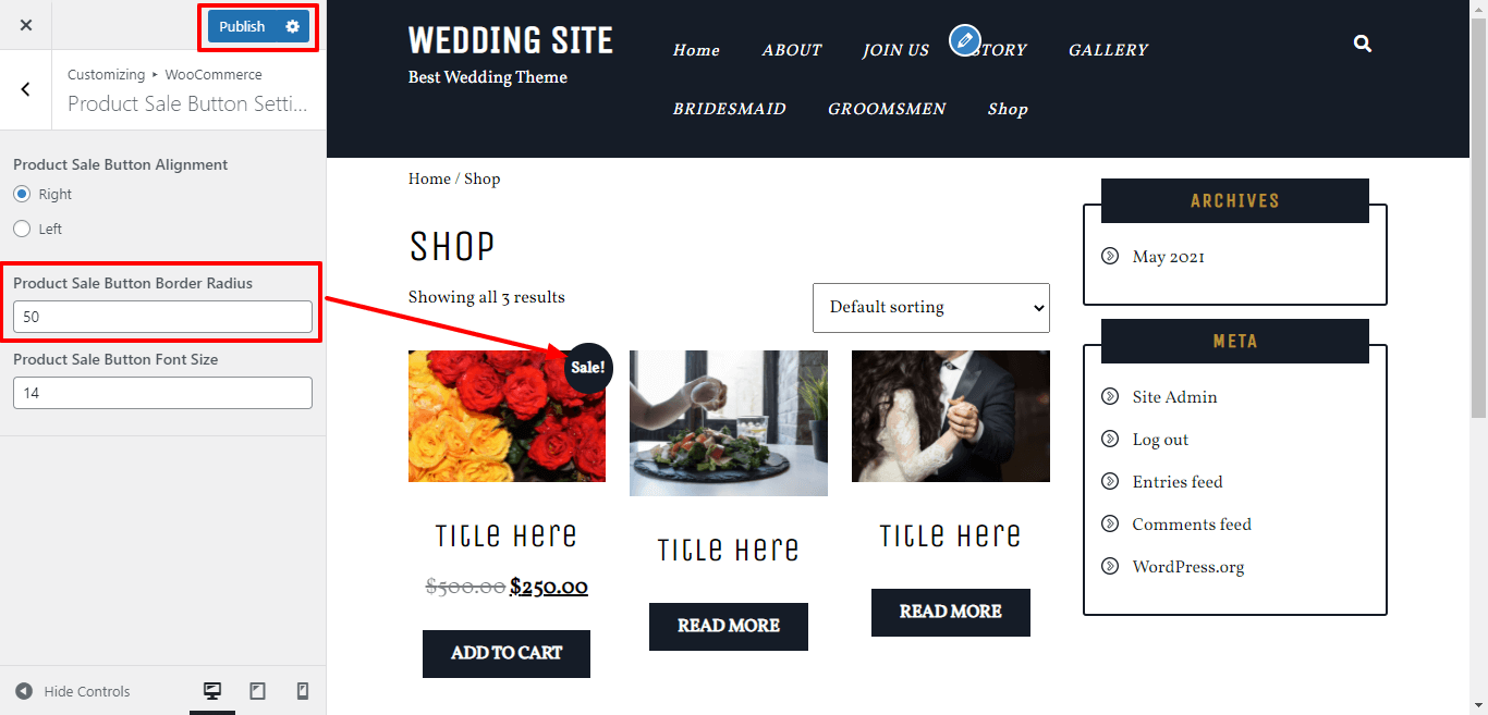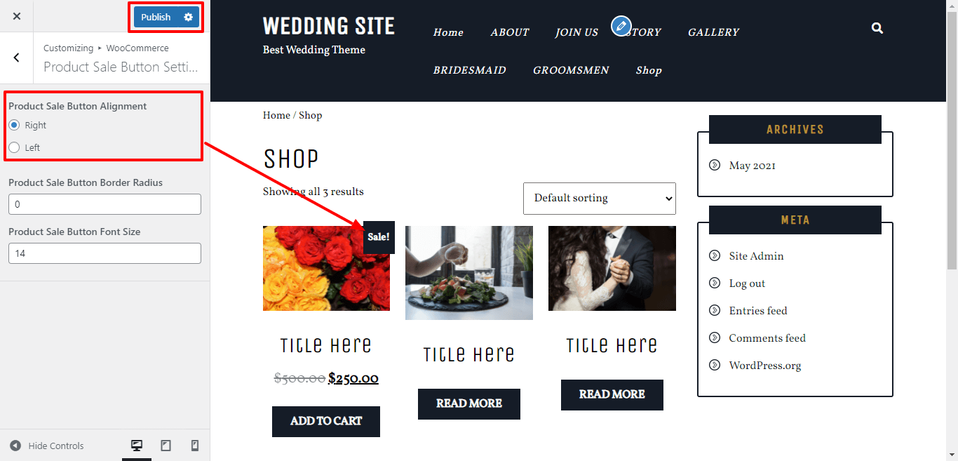 Go to Appearance >> Customize >> Woocommerce >> Product Sale Button Settings