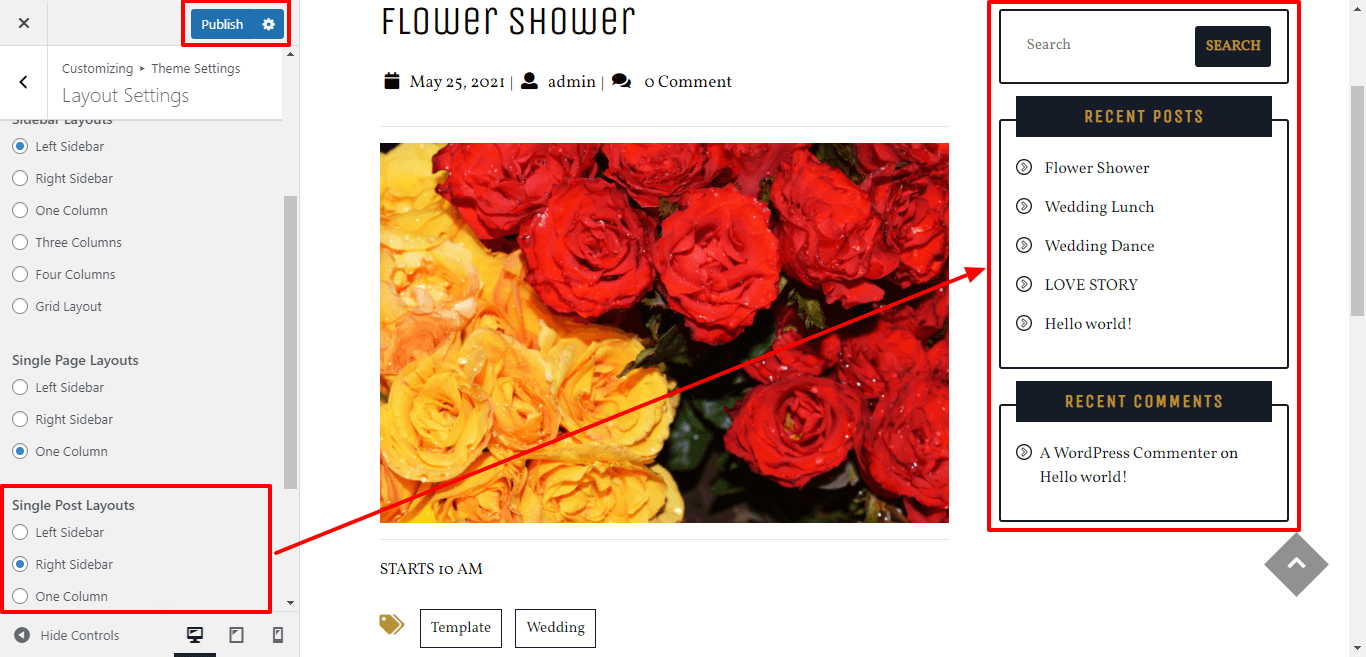 In Layout Settings, you can select the Single Post Layout Sidebar.