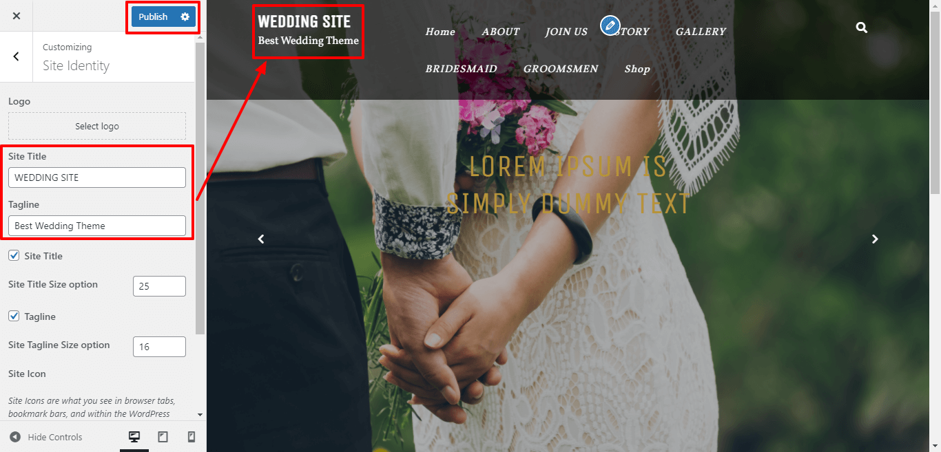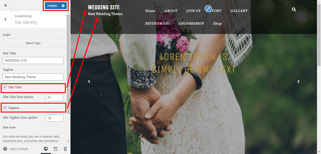 For show / hide site title and tagline for the theme, click on the checkbox for the theme.