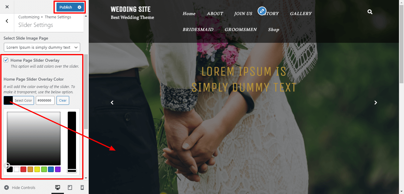 Here You can select show / hide slider image overlay and select the Background color, for Slider Image display transparent.