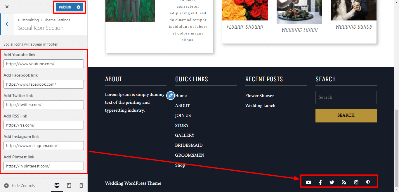 Go to Appearance >> Customize >> Theme Settings >>Social Icons Section