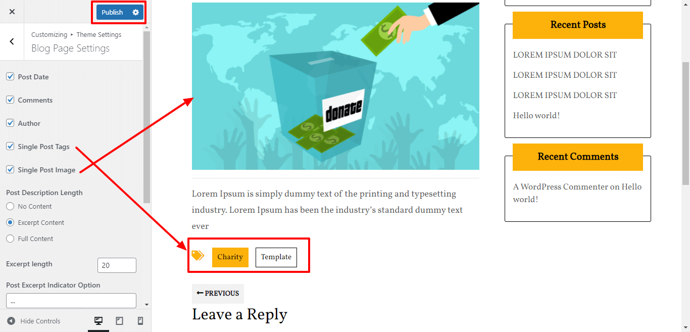 For show / hide single post tags and single post image, click on the checkbox for the theme.