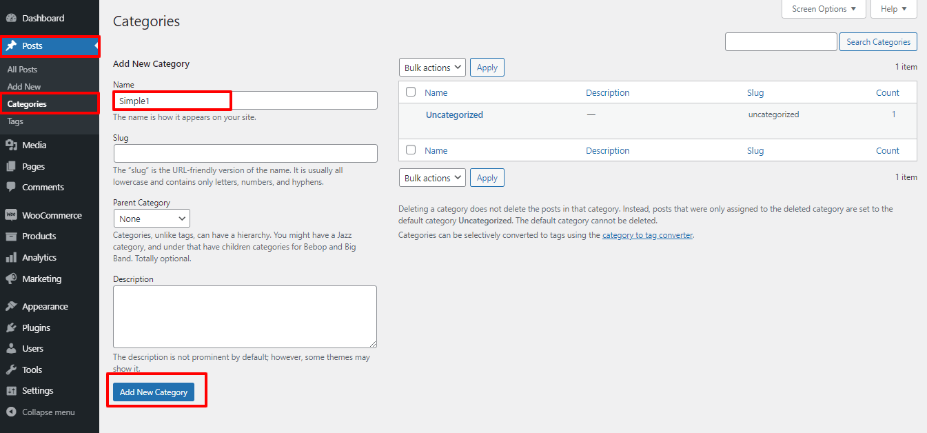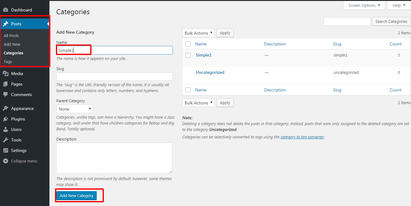 Here you can create the categories for the post, name it Simple1