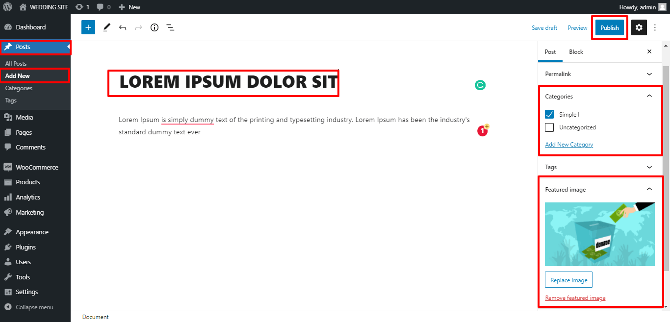 Here You can add the Title , Some content and featured image, select the Categories and then click on publish button.