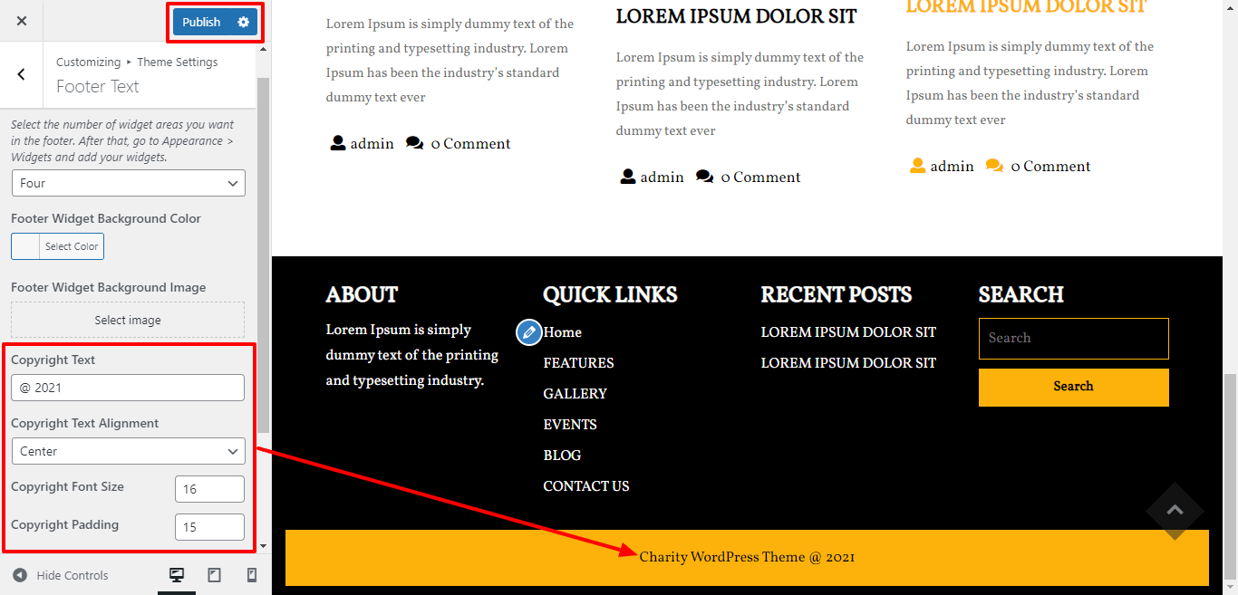 Once you add copyright text your footer text section will look like this.