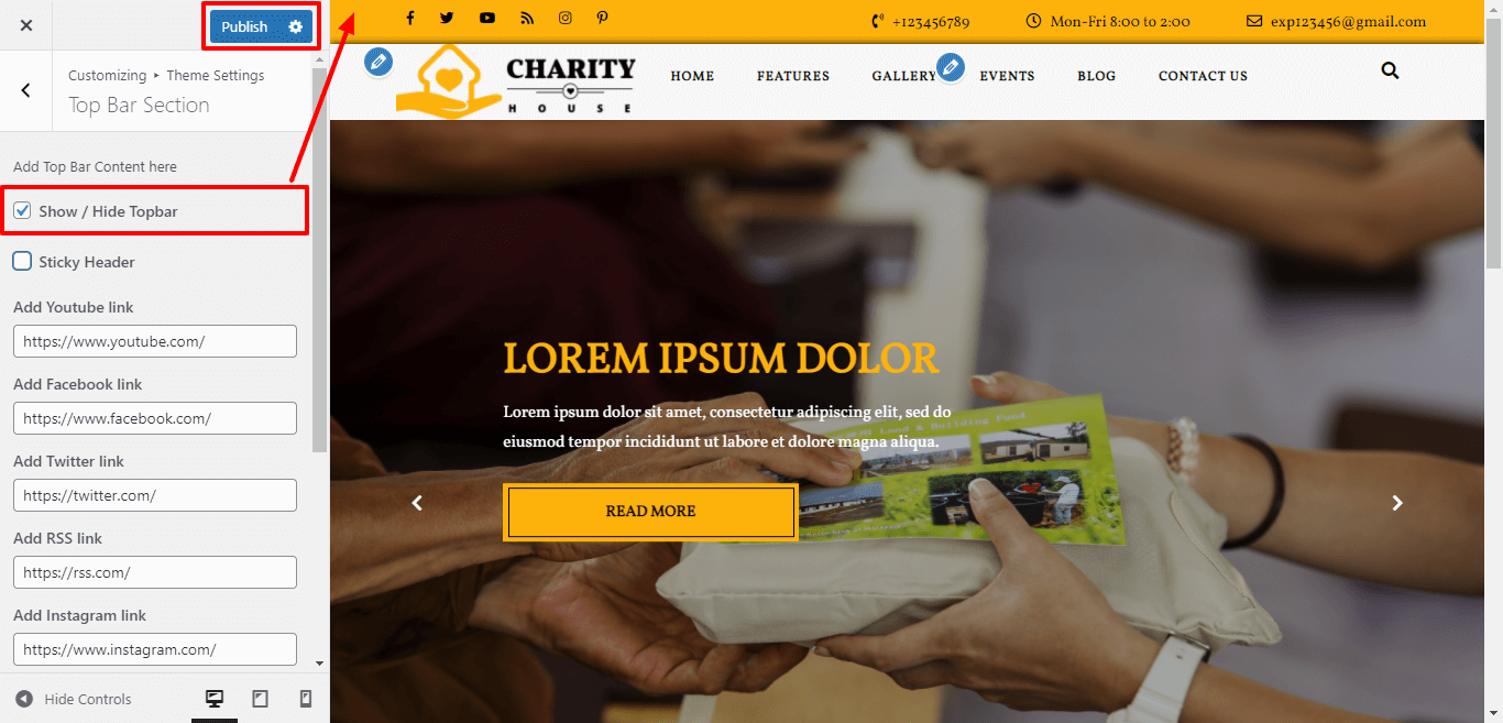 Go to Appearance >> Customize >> Theme Settings >> Top Bar Section