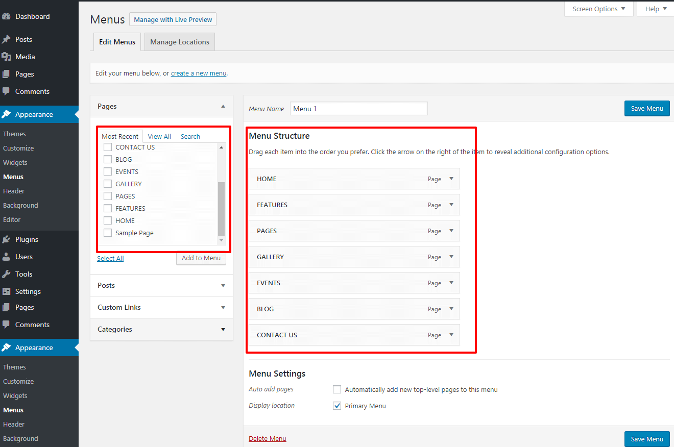 Once you have create menu. You need to add pages by selecting with checkboxes. After adding menu list you can arrange it by drag and drop.