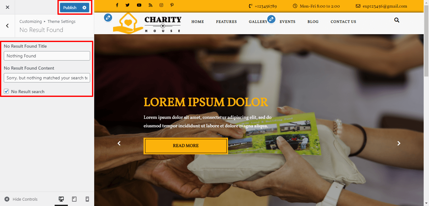 Go to Appearance >> Customize >> Themes Settings >> No Result Found