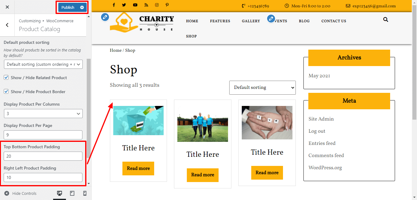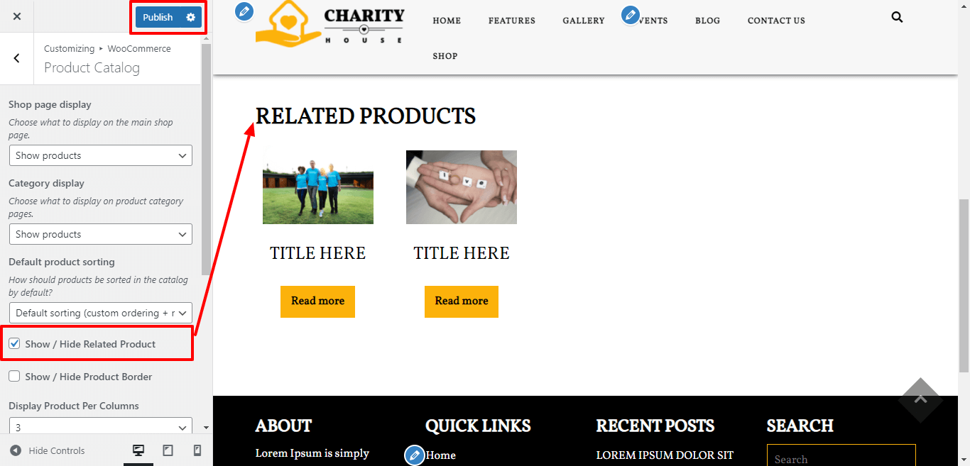 Here You have an option to Enable / Disable Feature Related product of shop page by click on checkbox.