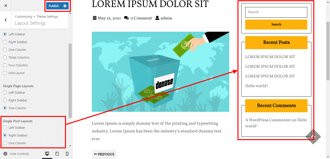 In Layout Settings, you can select the Single Post Layout Sidebar.