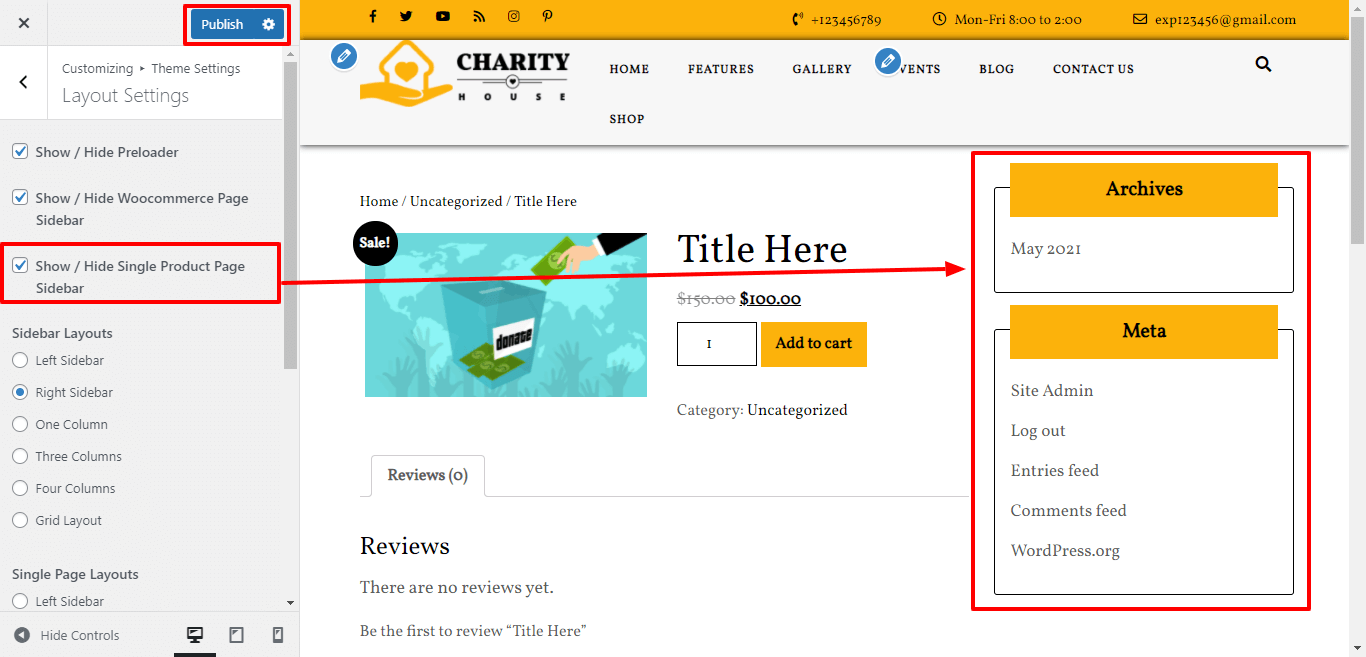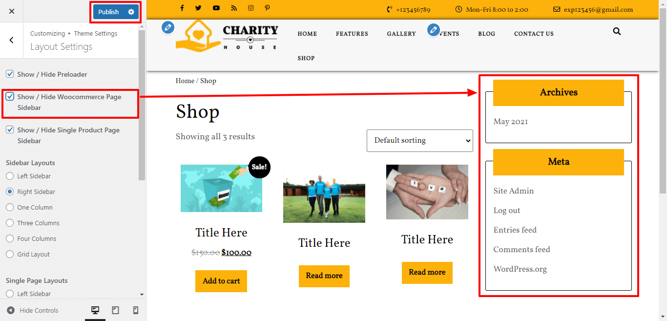 In Layout Settings, Here You can click the checkebox if you want to show / hide woocommerce page sidebar.