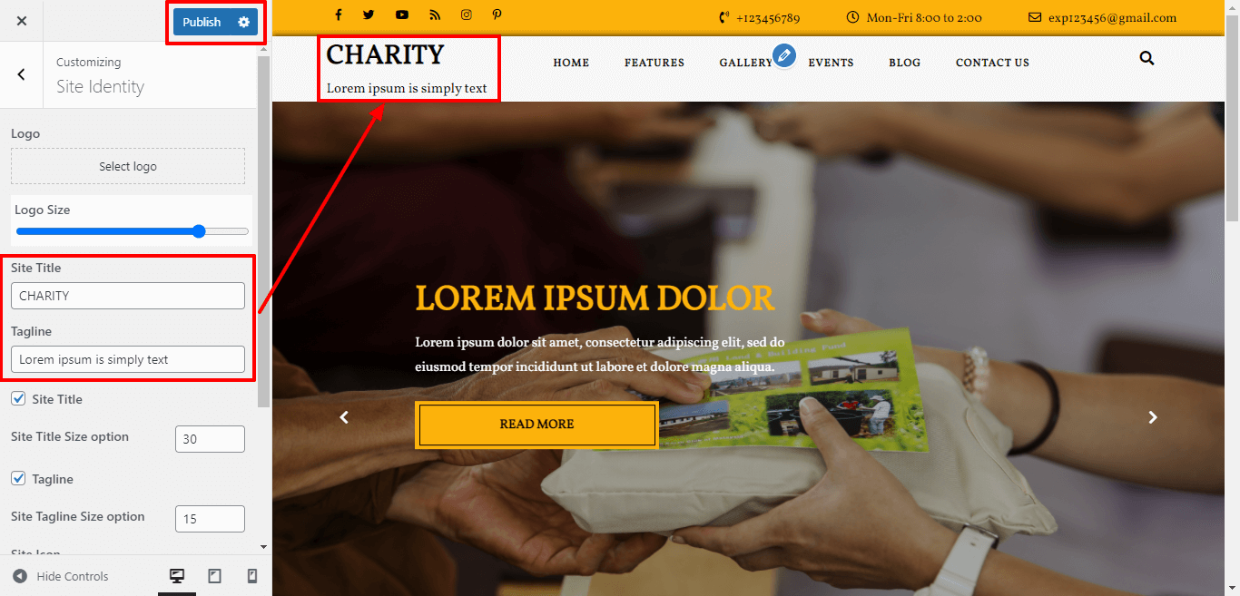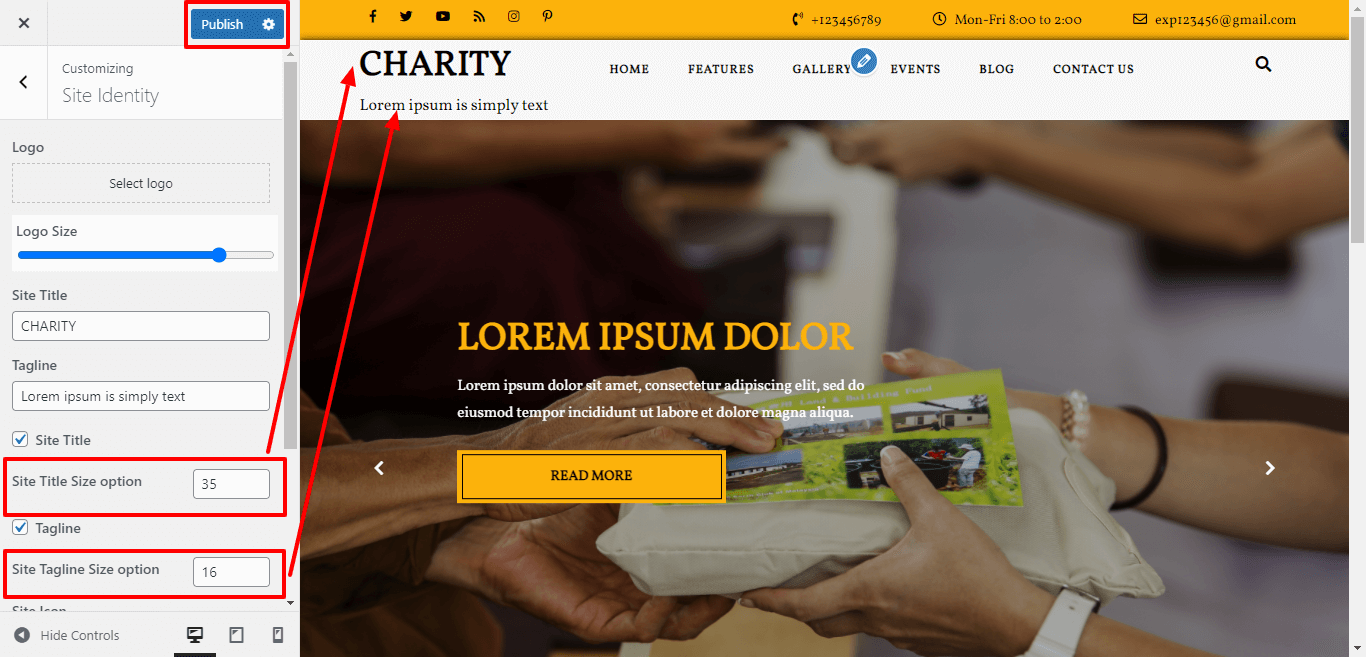 Here you can select the size for site title and tagline for the theme.