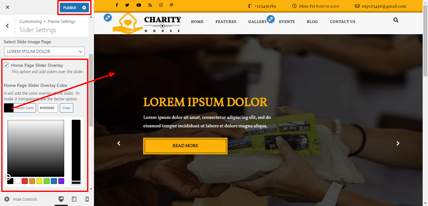 Here You can select show / hide slider image overlay and select the Background color, for Slider Image display transparent.