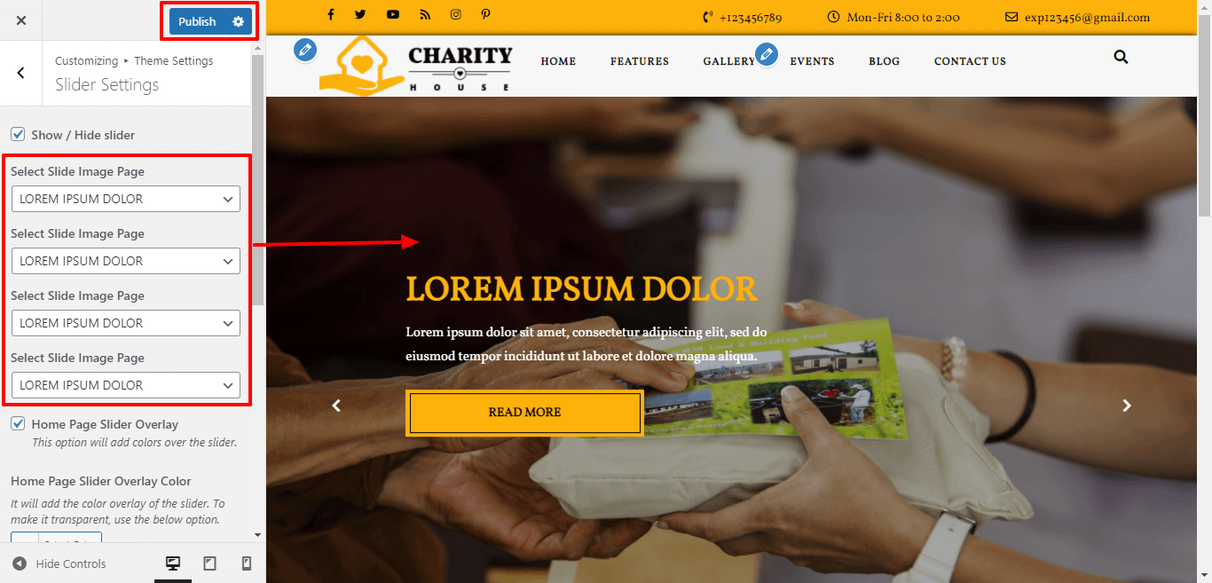For Slider:Go to Appearance >> Customize >> Theme Settings >>Slider Settings