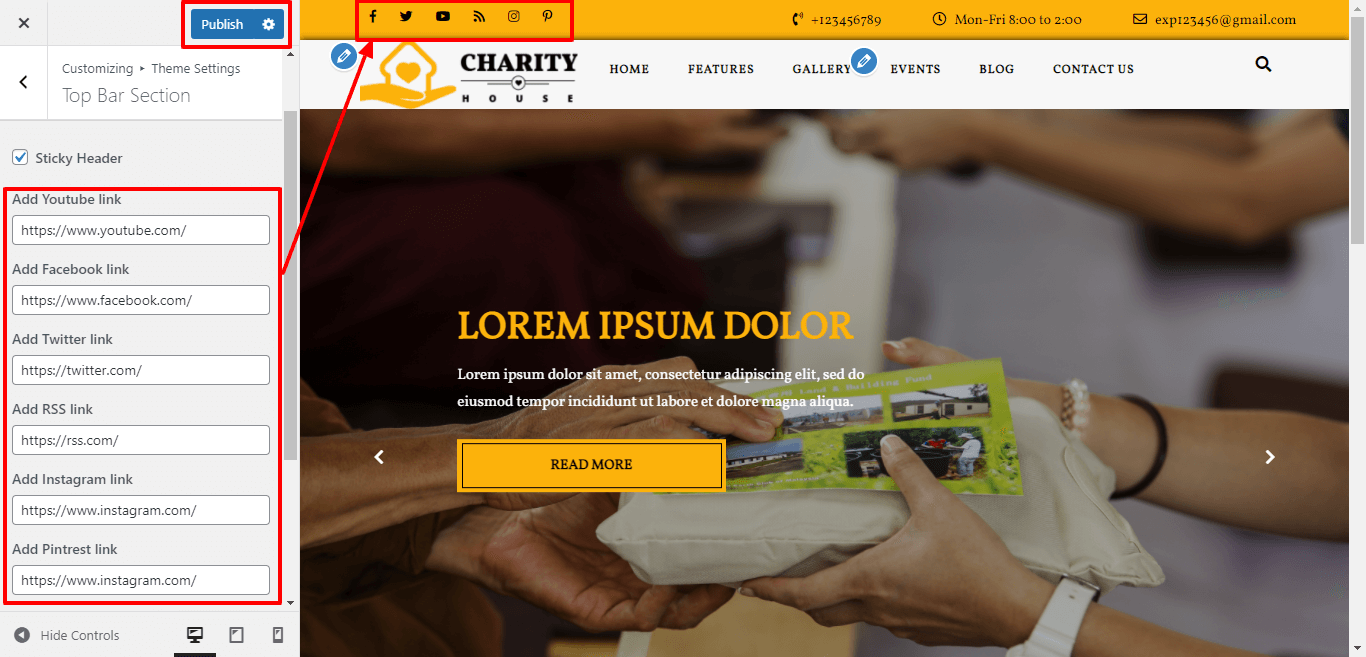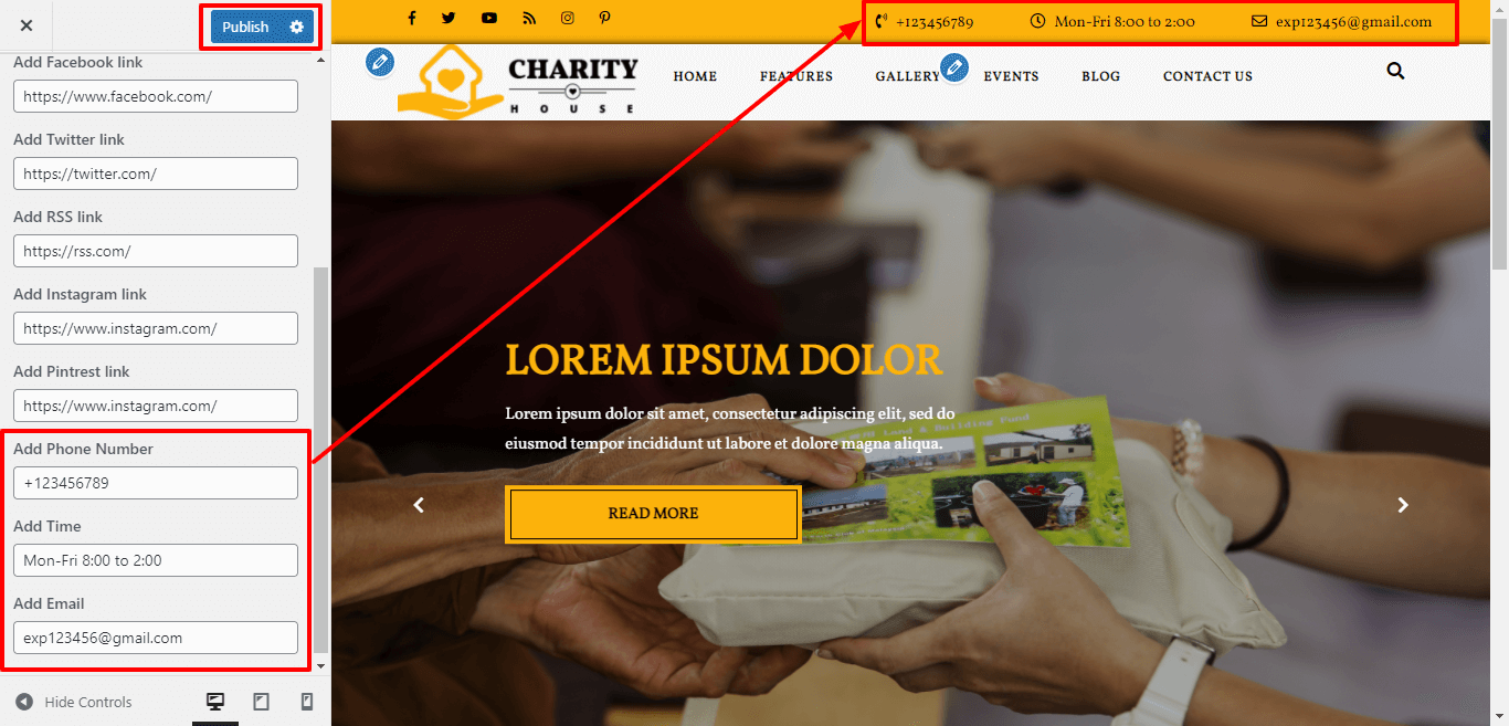 Here you can add Phone number , Email and Time which will get appear at the topbar section.