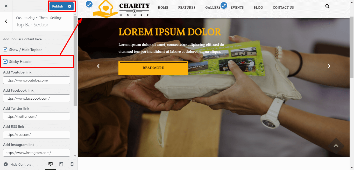 For the sticky header of the theme click on checkbox for the theme.