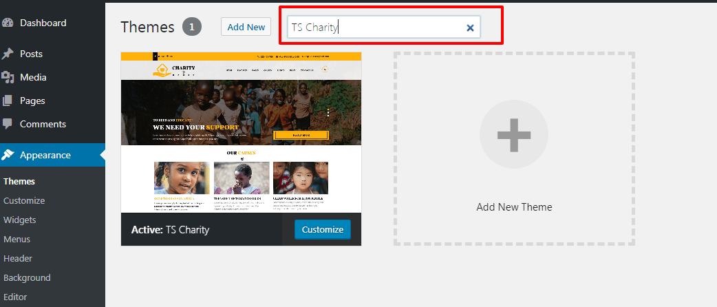 Based on your search, you will see a single theme or a list of themes that met your criteria. In our case, we searched for the theme TS Charity.