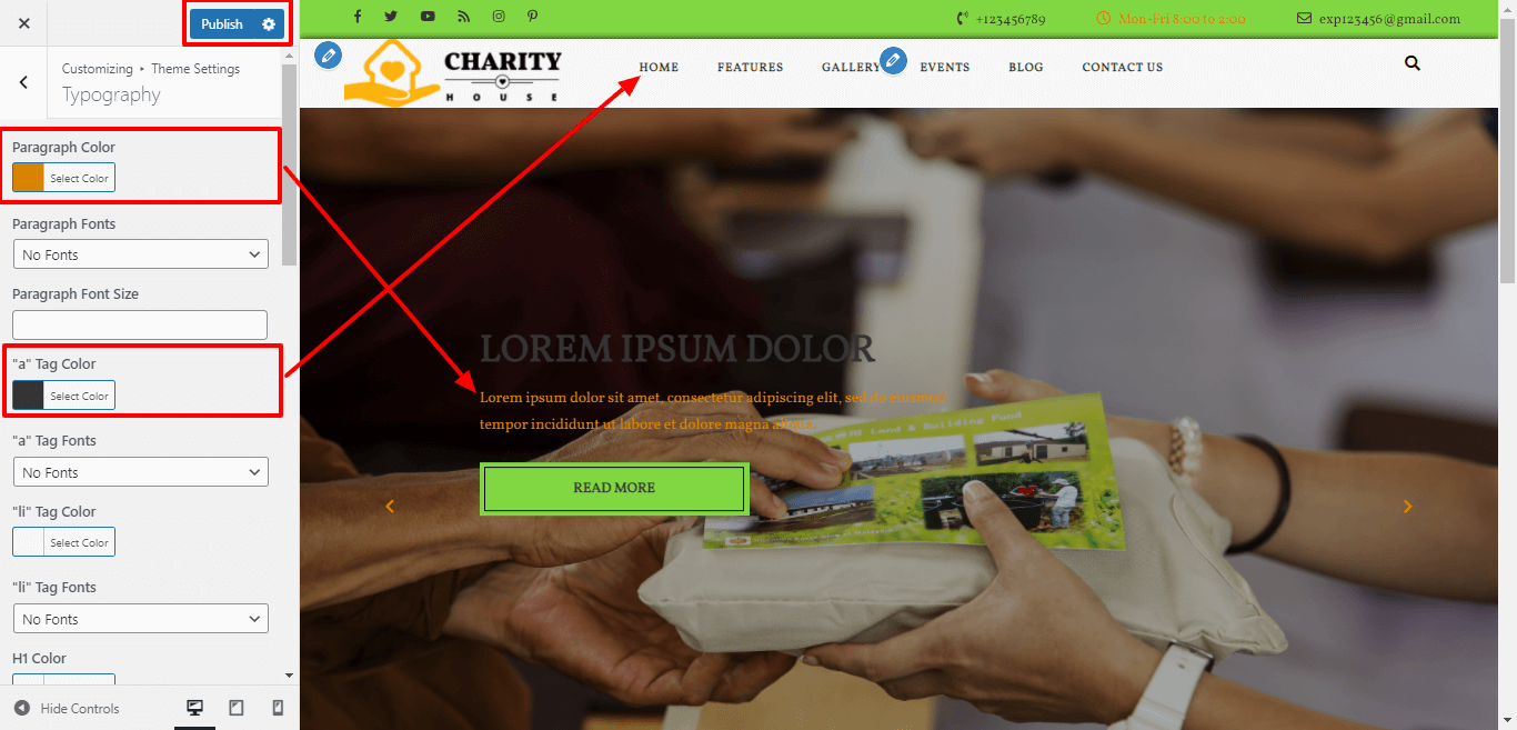 1. Color: Here you can change the colors of all Paragraph, 'a' tag, 'li' tag, H1, H2, H3, H4, H5 and H6 respectively.