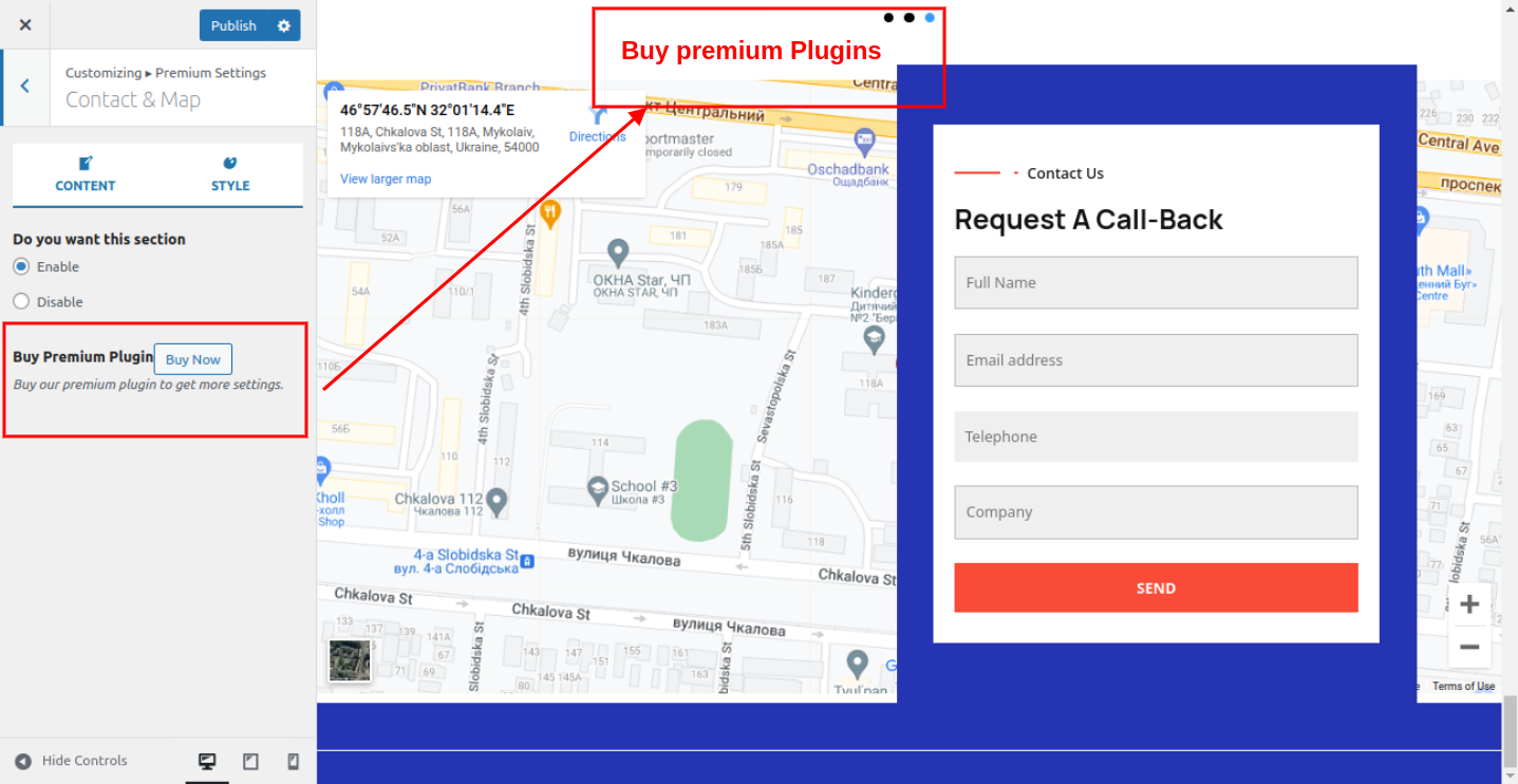 In this way you can setup contact and map section