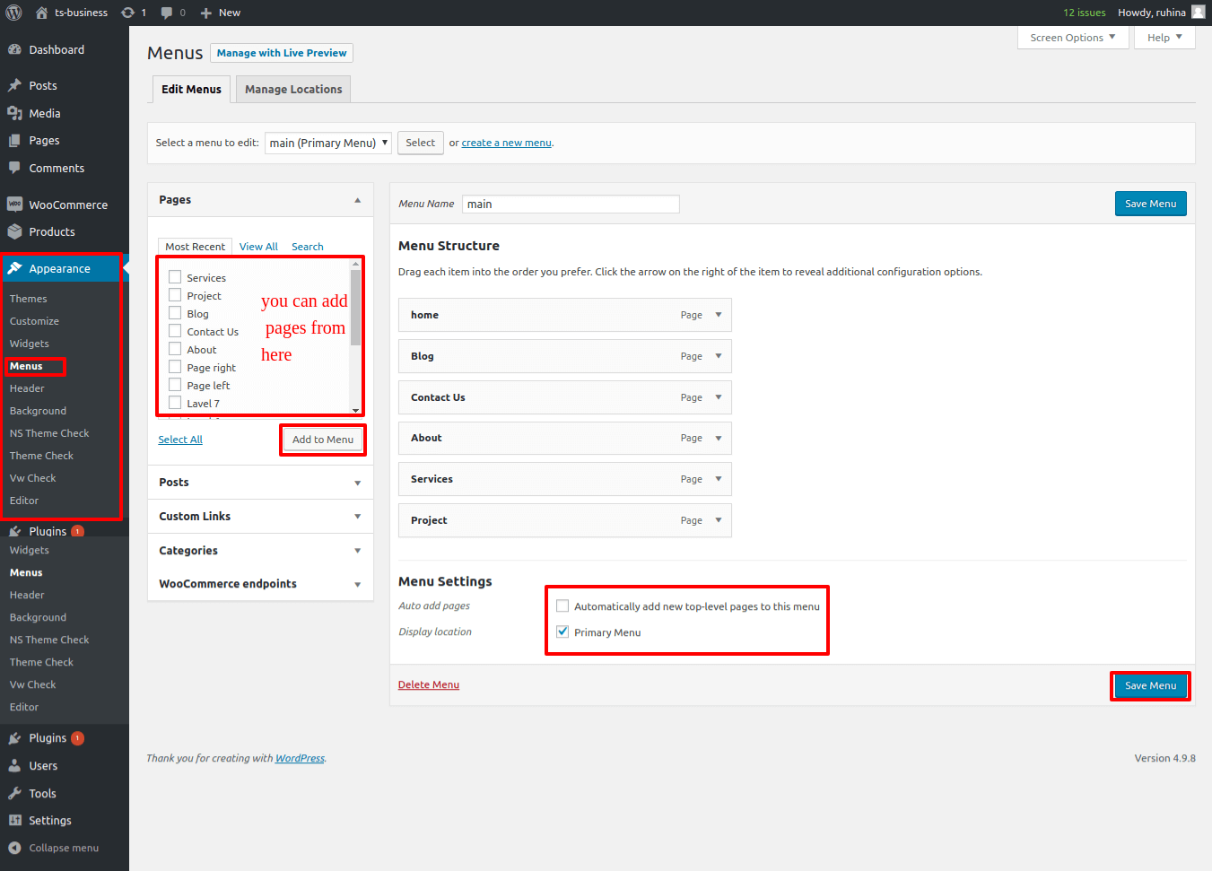 Once you have create menu. You need to add pages by selecting with checkboxes. After adding menu list you can arrange it by drag and drop.