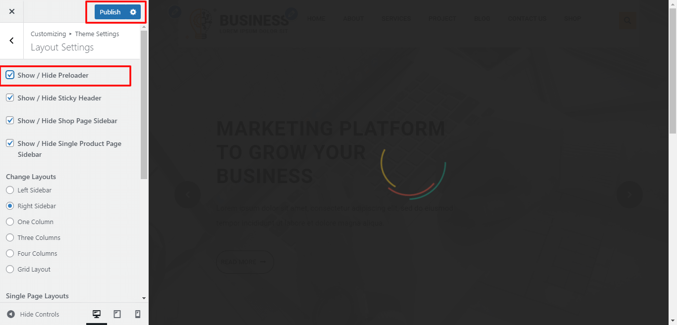 Here You can click the checkebox if you want to Show / Hide preloader.