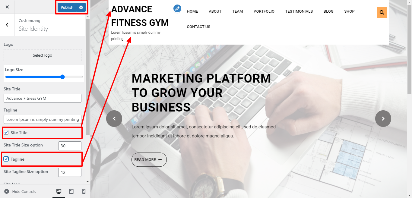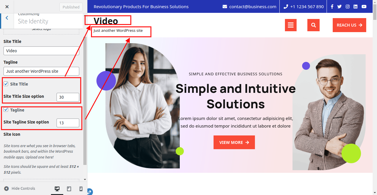 Here you can select the size for site title and tagline for the theme.