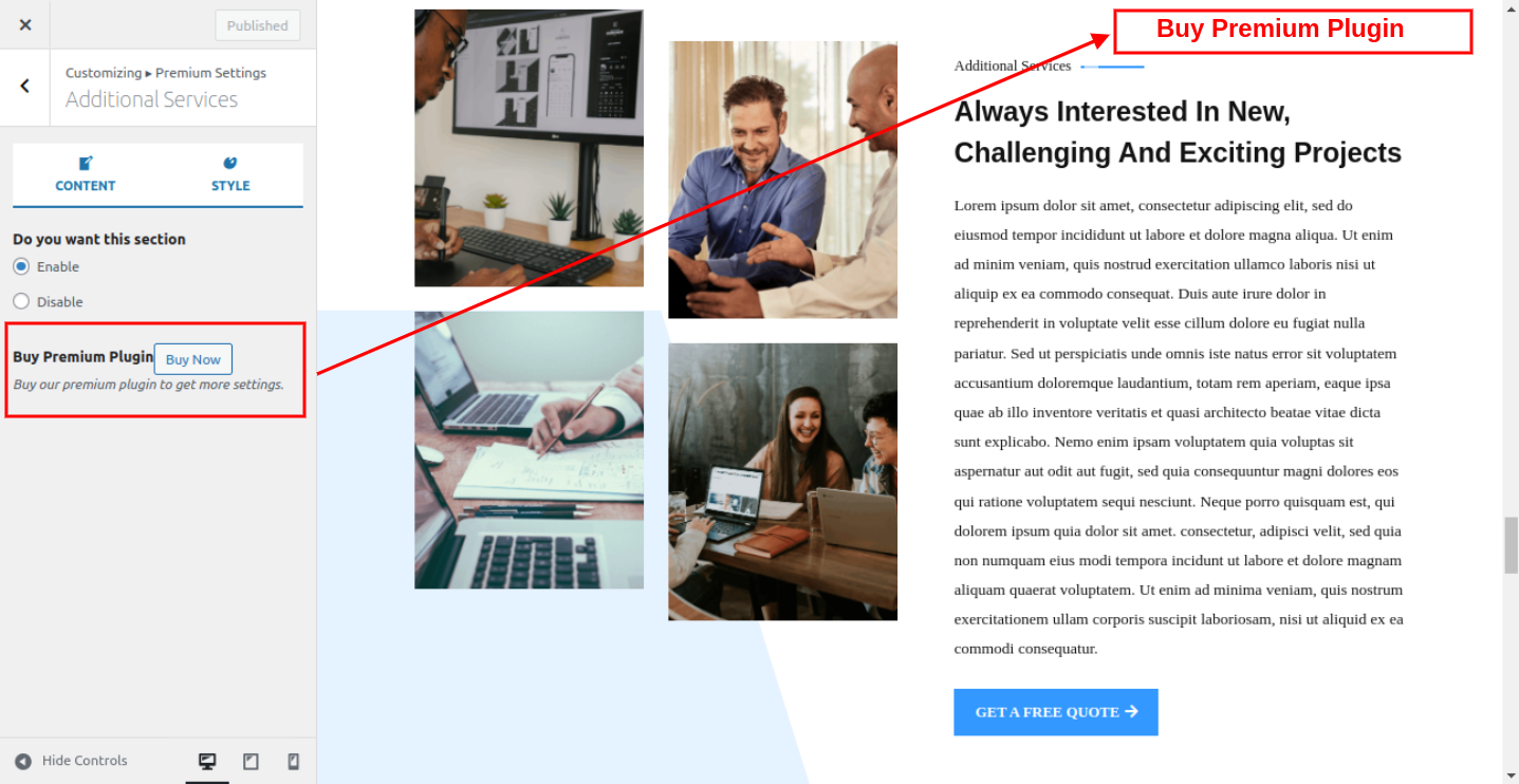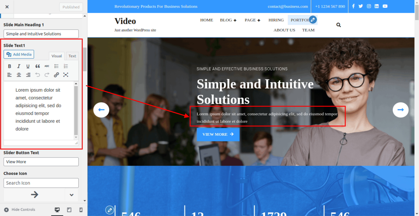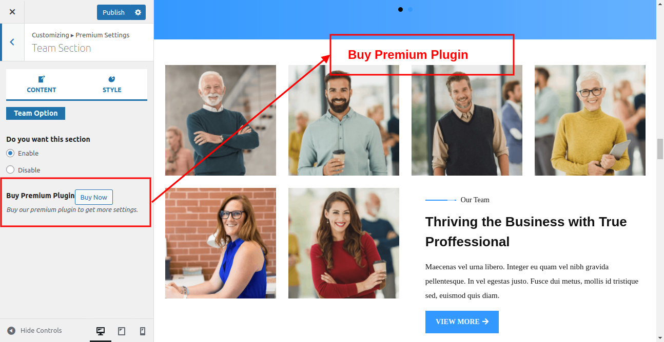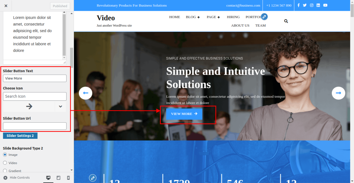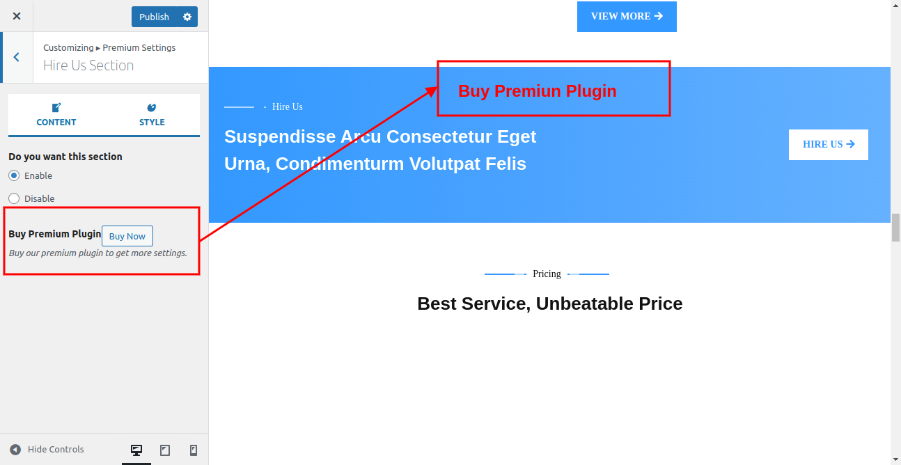 Go to Appearance >> Customize >> Theme Settings >> Hire Us