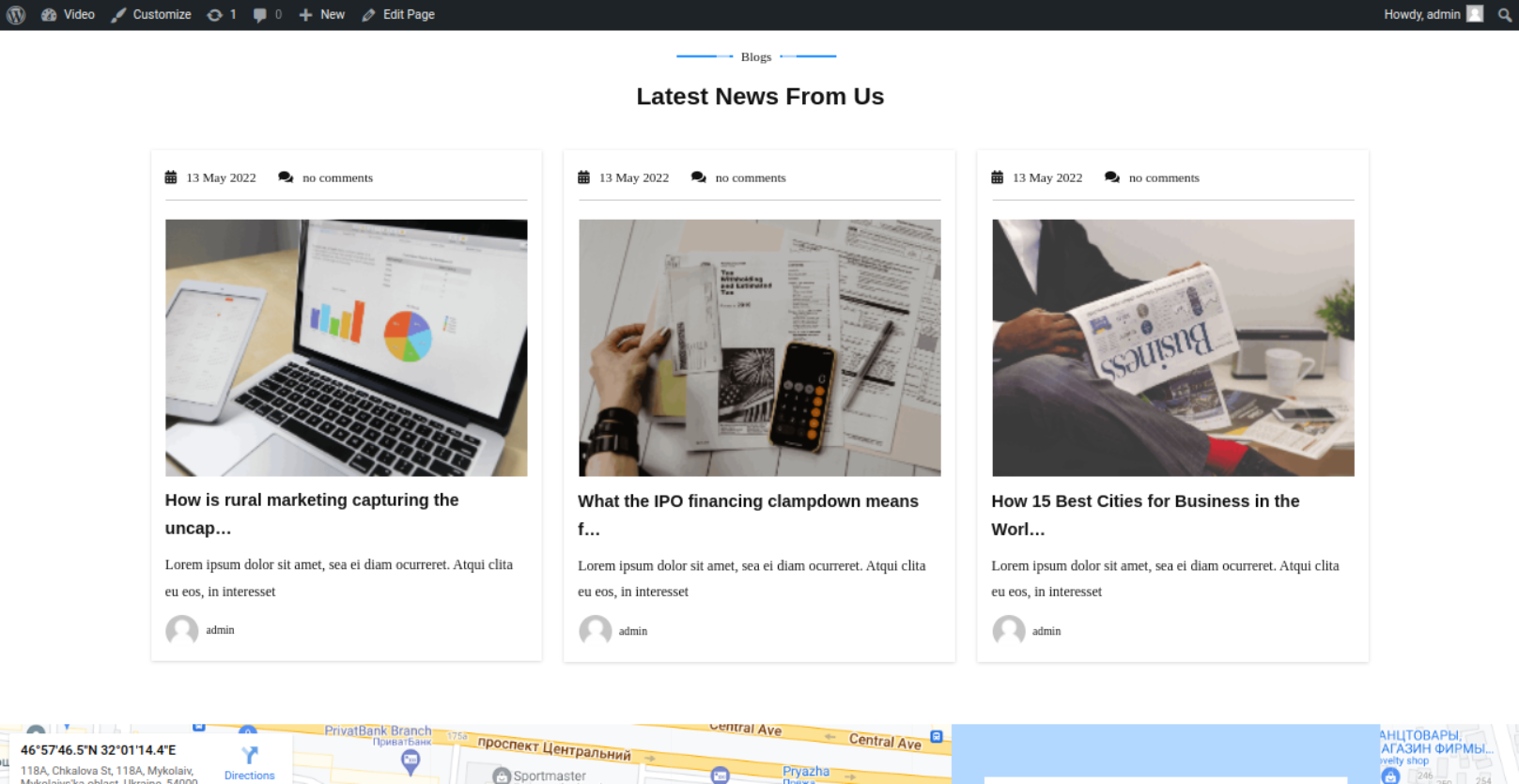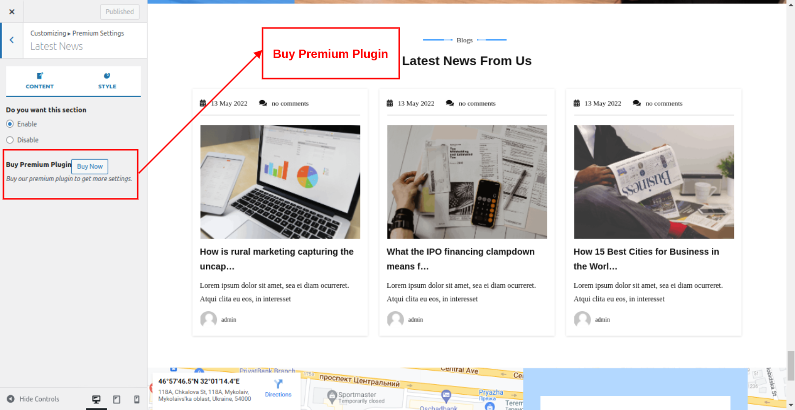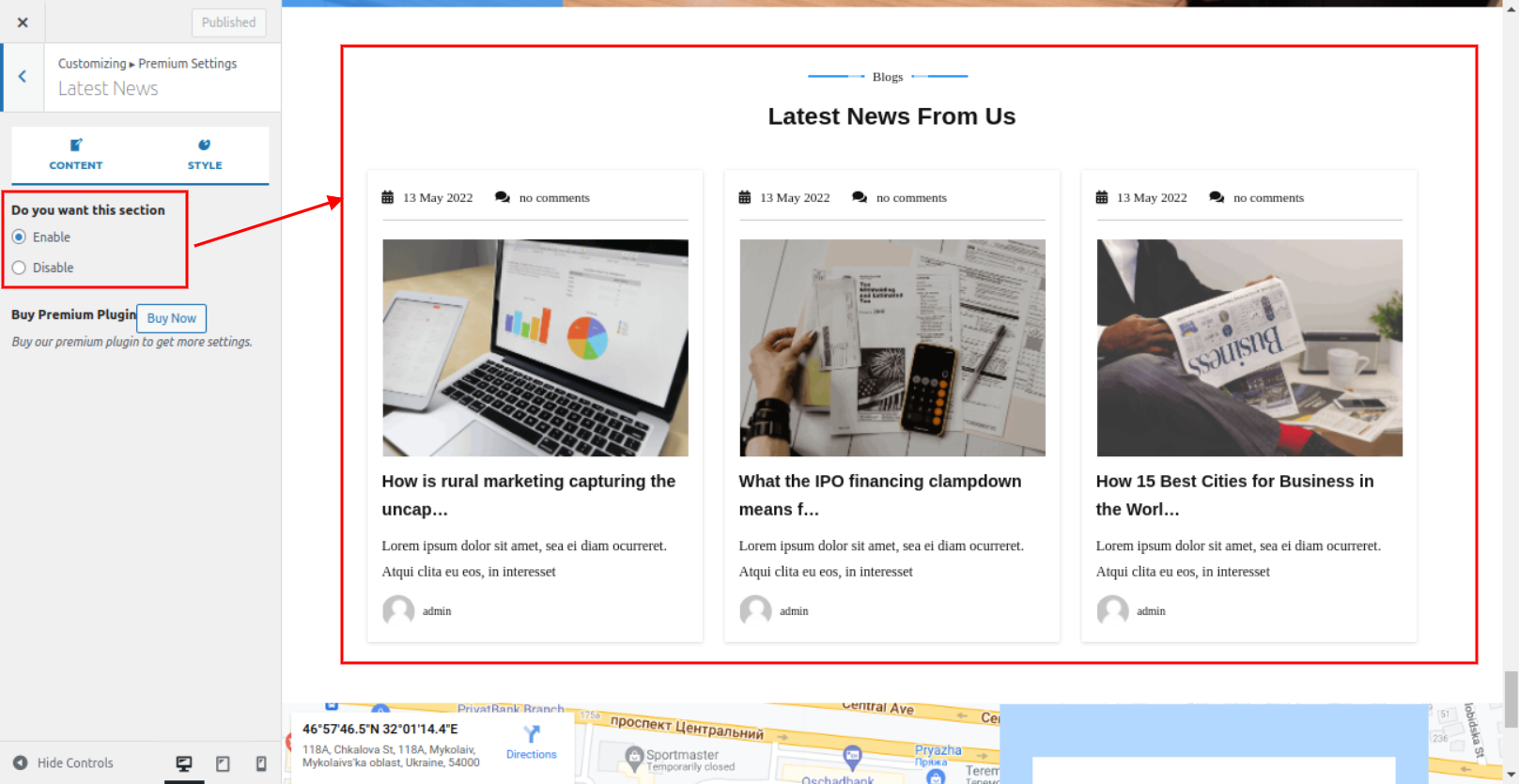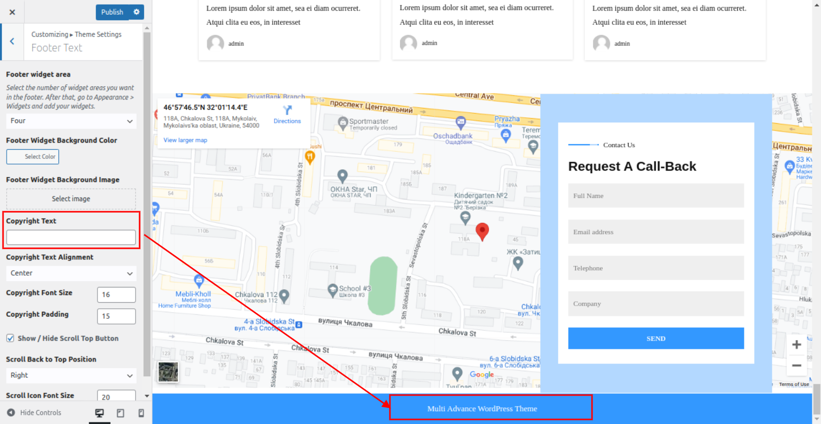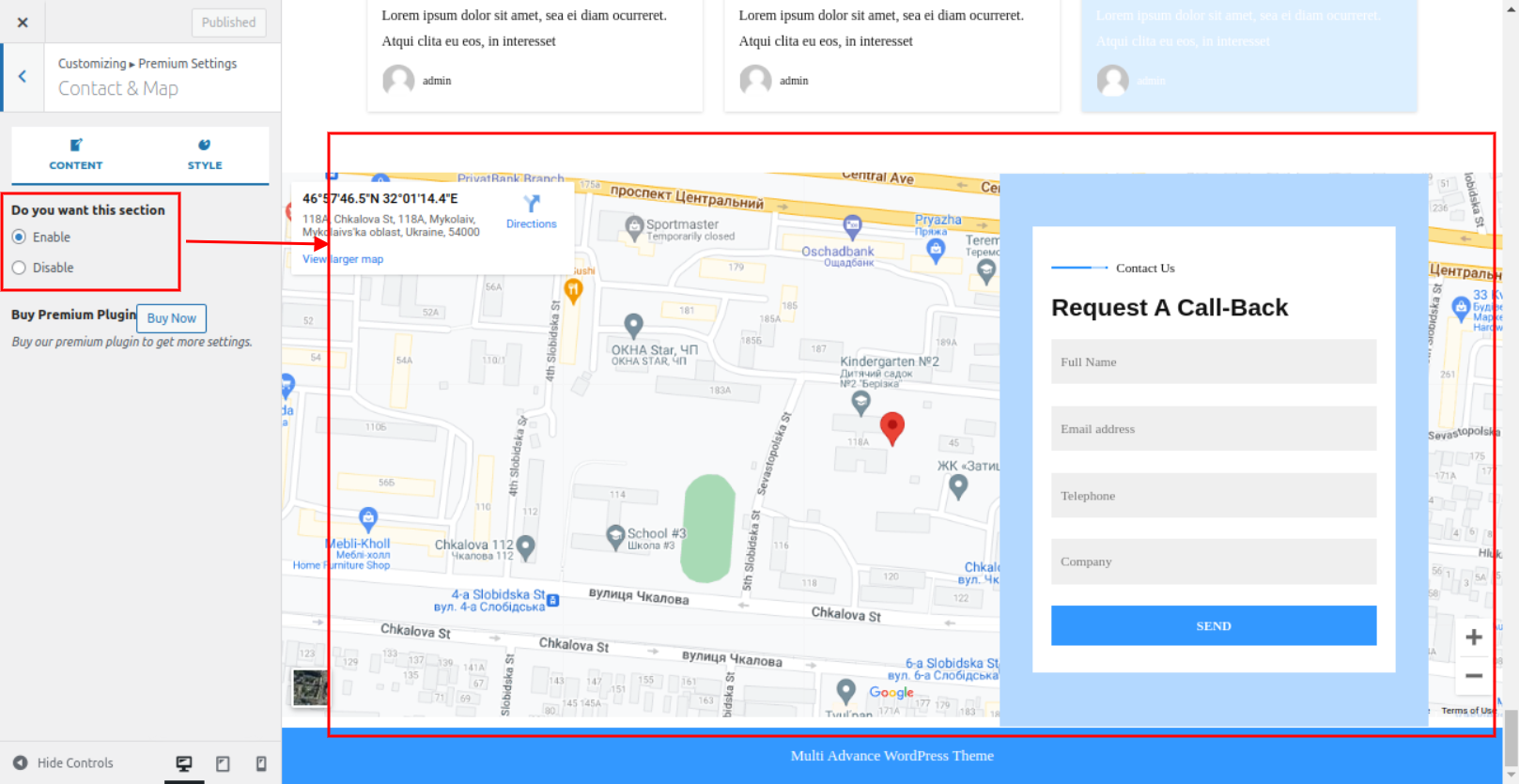 Go to Appearance >> Customize >> Theme Settings >> Contact and Map