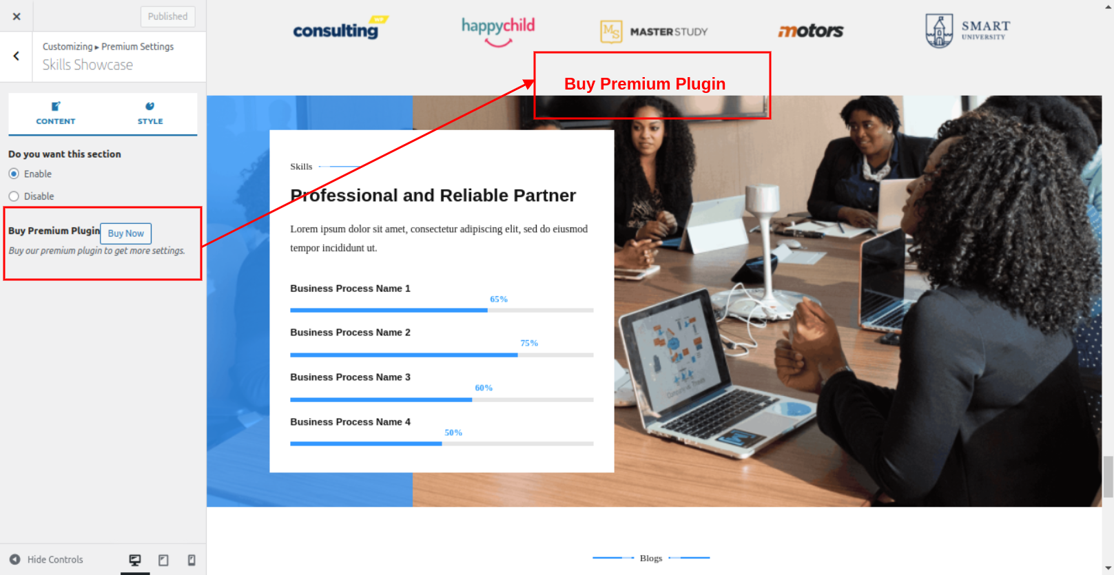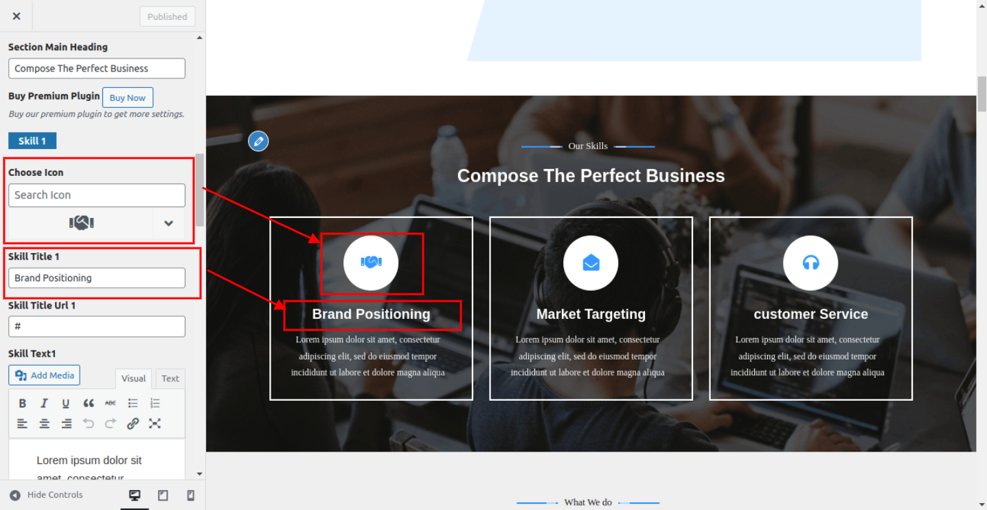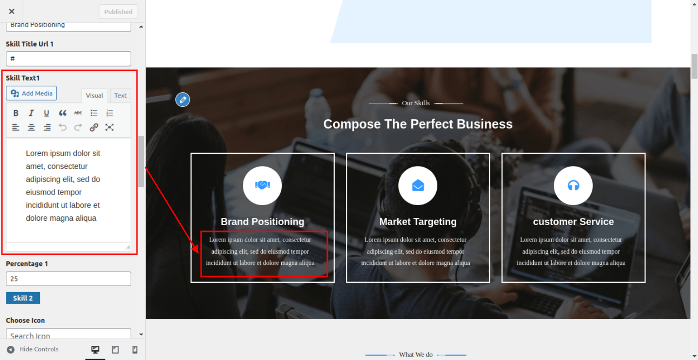 Go to Appearance >> Customize >> Theme Settings >> Skills Showcase