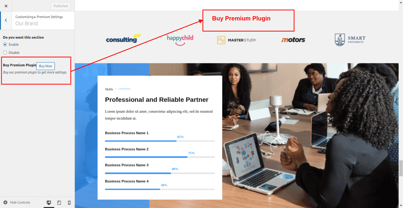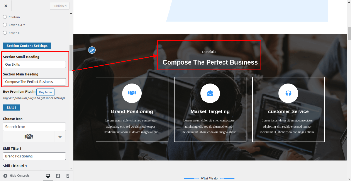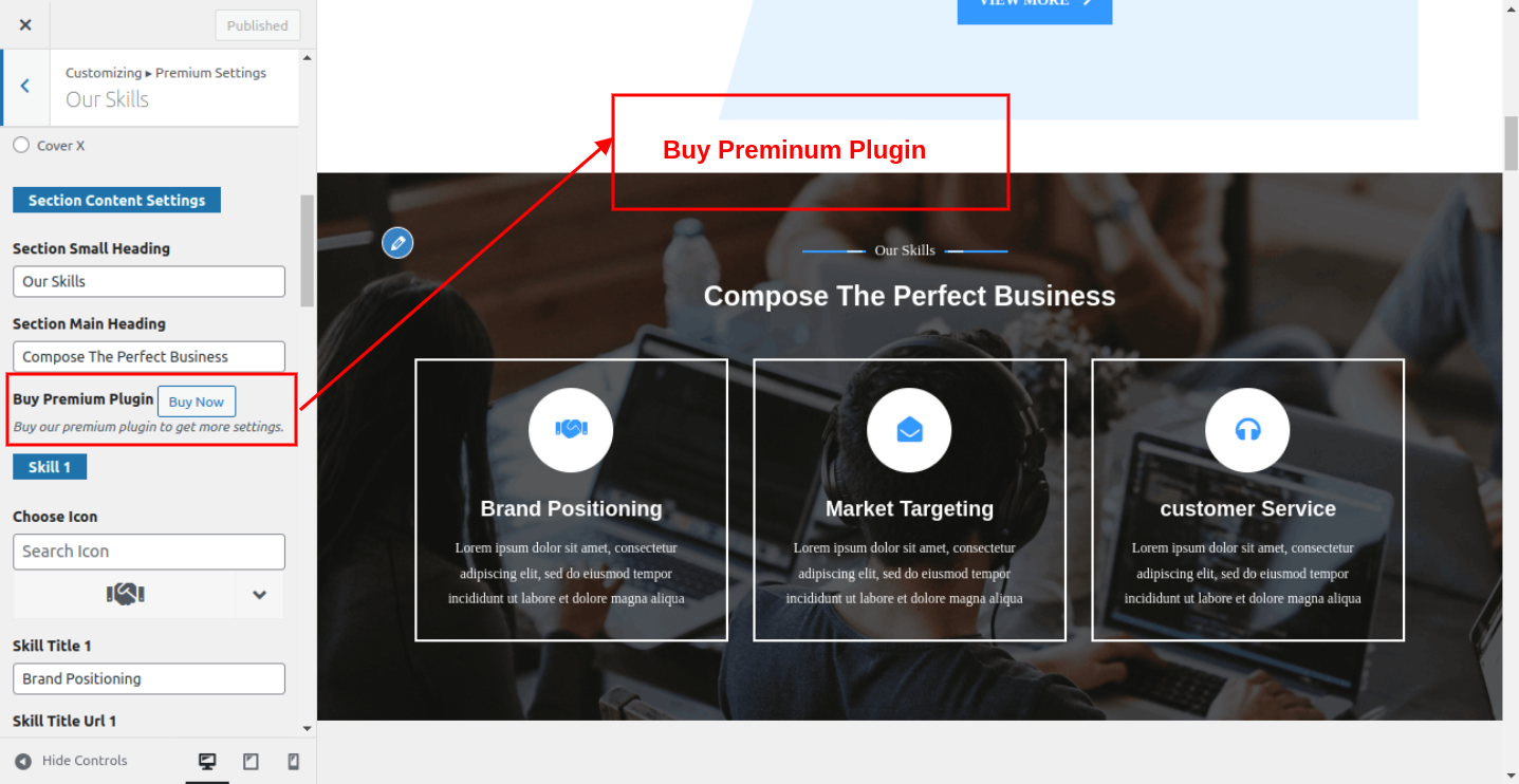 Go to Appearance >> Customize >> Theme Settings >> Skills Showcase