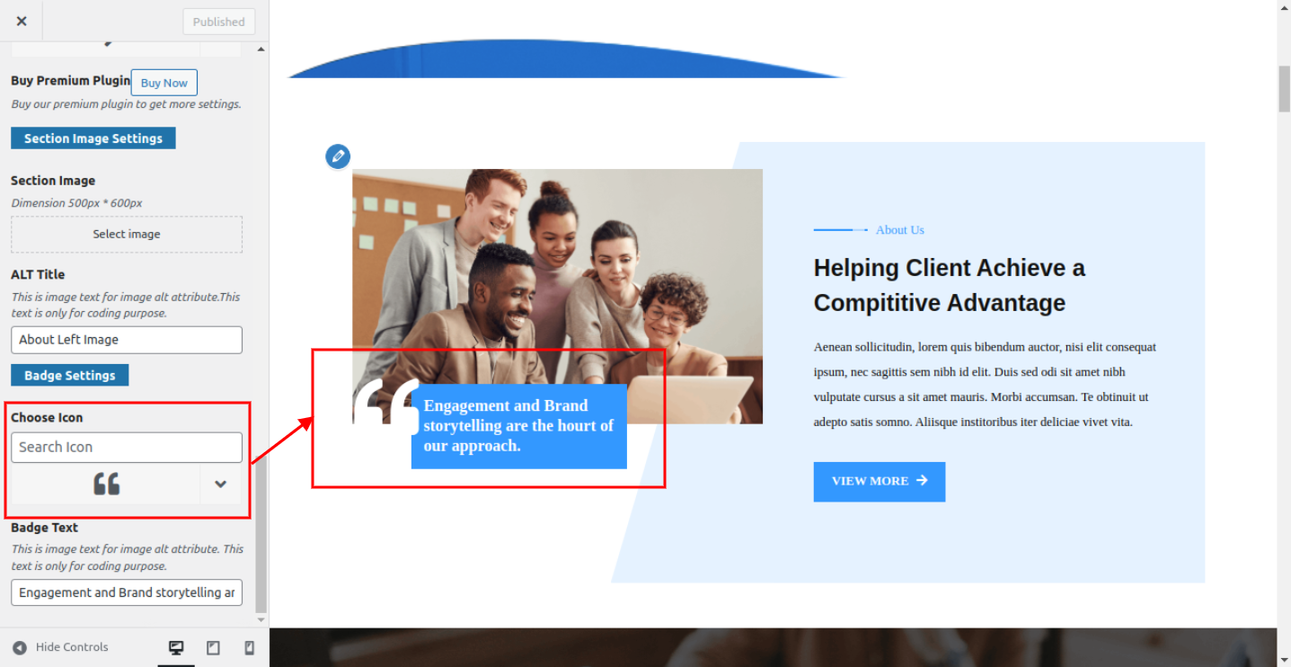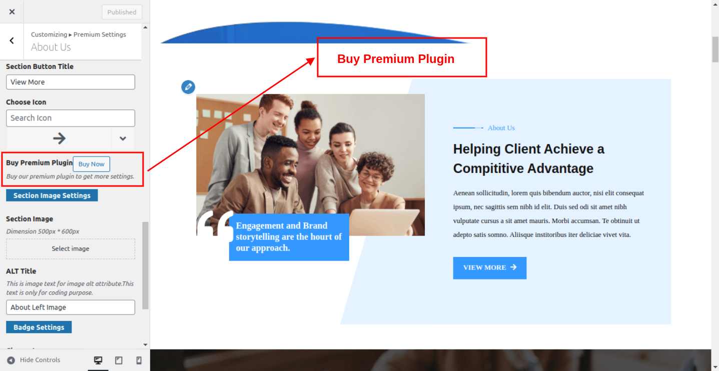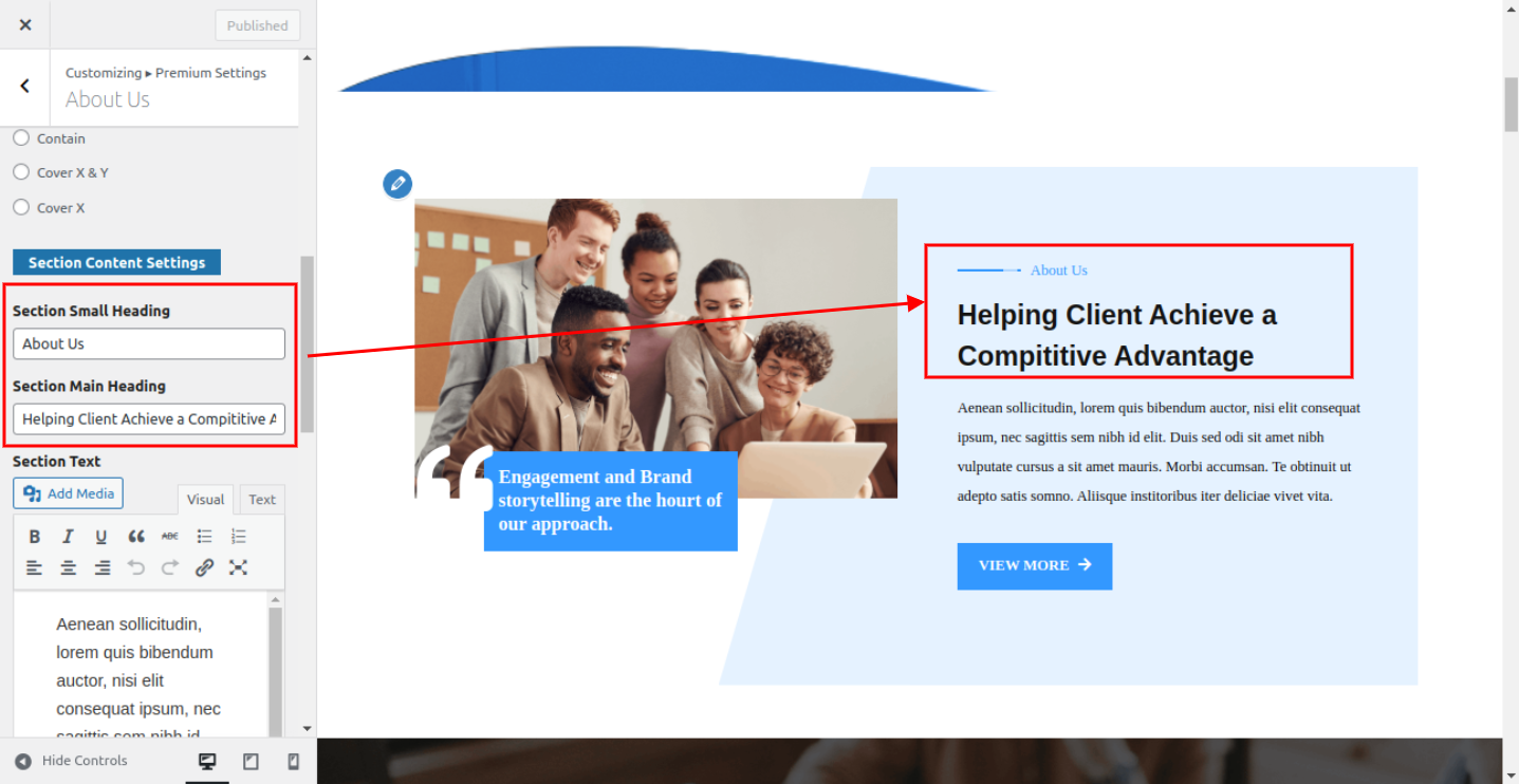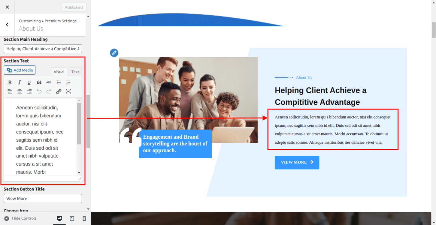 Go to Appearance >> Customize >> Theme Settings >> About Us
