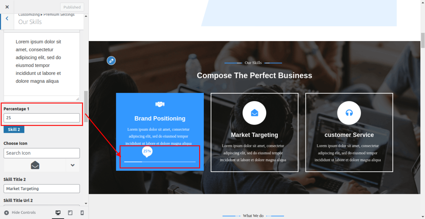 Go to Appearance >> Customize >> Theme Settings >> Our Skills