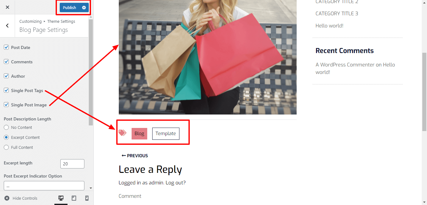 For show / hide single post tags and single post image, click on the checkbox for the theme.