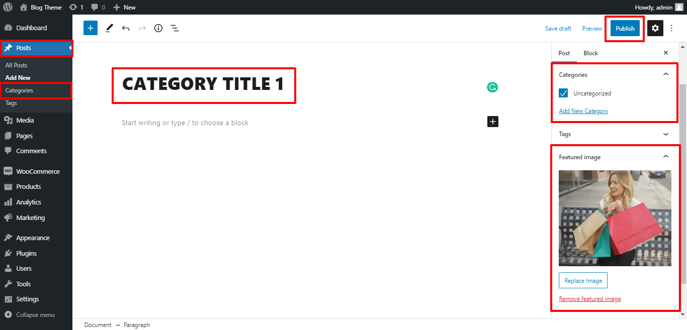 Here You can add the Title , Some content and featured image, select the Categories and then click on publish button.
