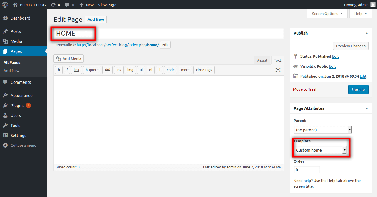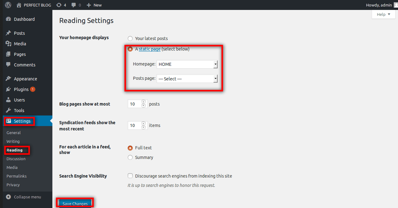 2. Set the front page: Go to Setting -> Reading --> Set the front page display static page to home page
